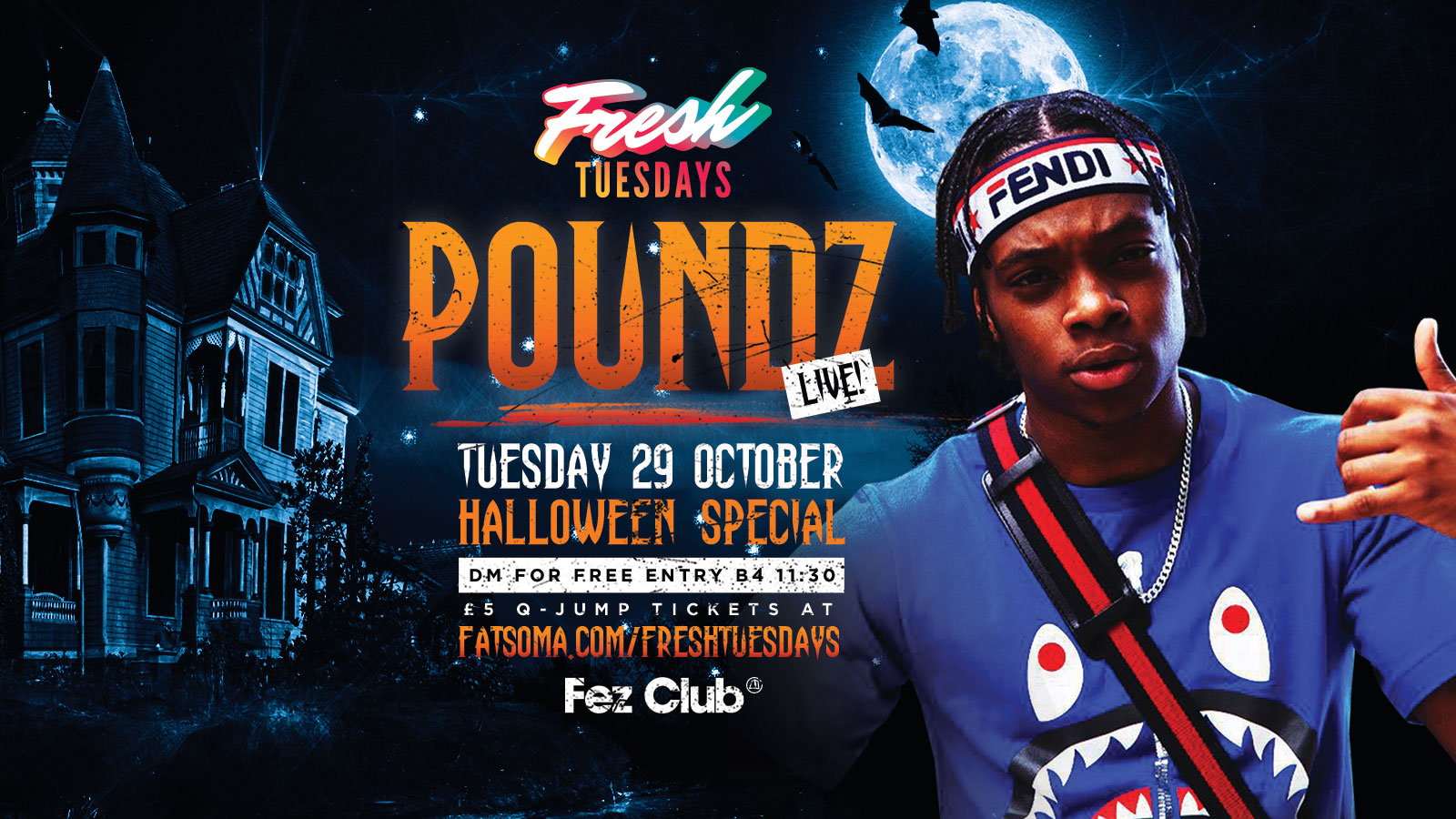 Catch Poundz performing his smash hits Op Thot, Skengbop, Mourinho & more live at Fresh Tuesdays for our Halloween special on Tuesday 29 October.
