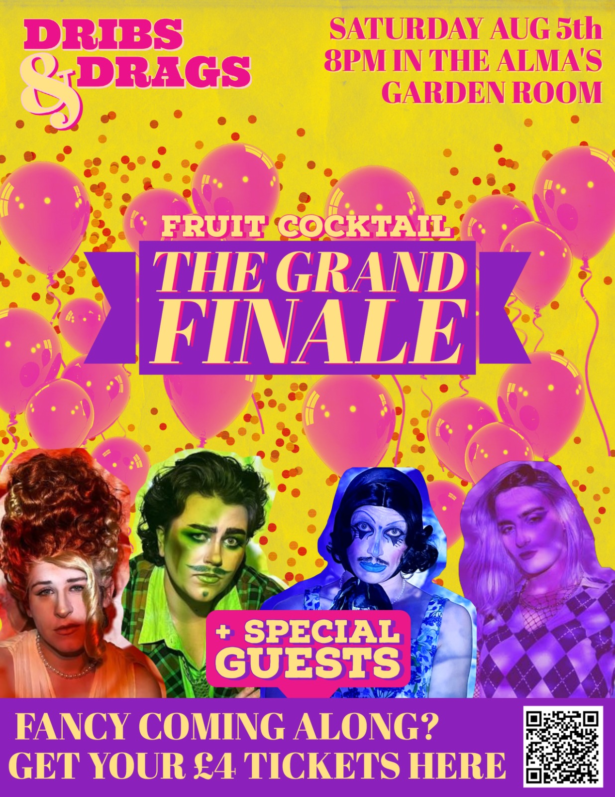 Join Dribs and Drags, a South London based Drag collective for our final club night at the Alma with the theme 'The Grand Finale' at The Alma in Sidcup. Expect Campery, Chaos and a small squeeze of 'Class'. All purchased tickets come with one FREE SHOT or soft drink of your choice! The venue is cash only but for all you card carrying cuties a cash point can be found just around the corner at the Tesco Express.