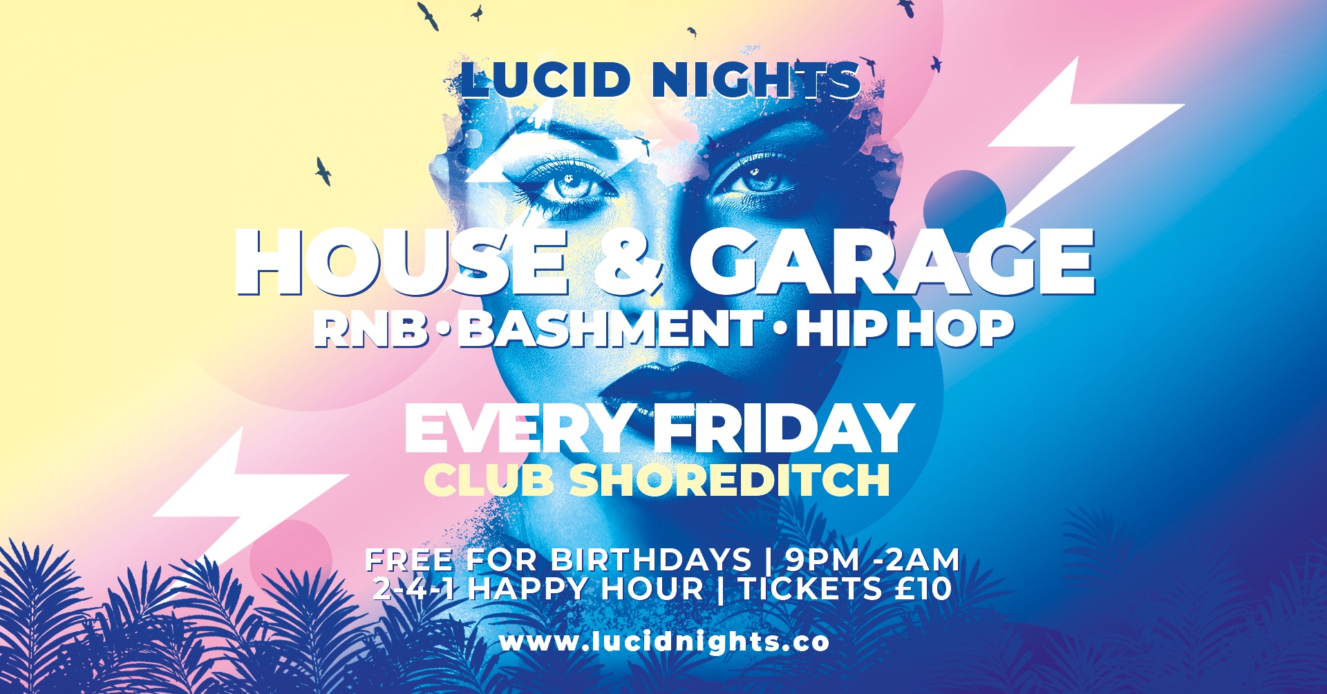 Tell your friends and party with us at Lucid Nights as we bring you Good Vibes EVERY Friday with a perfect mix of House & Garage + Old Skool RNB. We've also got 2-4-1 Happy Hour from 9pm - 10pm + FREE entry for birthday's all taking place in central London's best and newest nightclub Club Shoreditch.