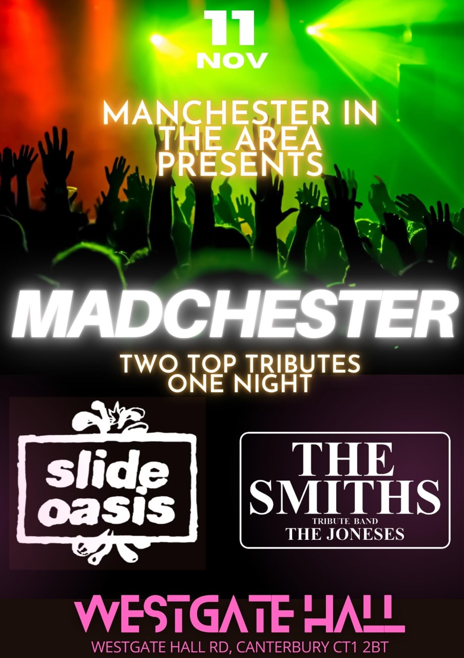 Join a sea of Mancunian joy and reverence, with the enthusiasm and passion of fellow cult band fans. Manchester in the Area presents premier tribute acts of Oasis and The Smiths: Slide Oasis and The Joneses. Bringing the visceral live performances of Manchester’s legends to the Westgate Hall Canterbury. This event will bring back cherished memories or introduce you to some of the most influential and inspiring bands of the 80s and 90s in UK Music history, and will leave you inspired and exhausted from shear enjoyment.