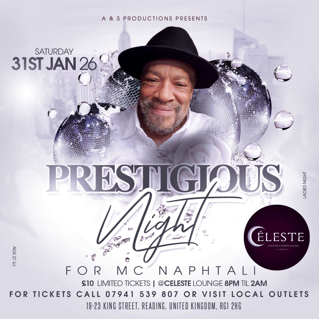 A & S Productions proudly present Prestigious Night — an elegant evening of grown and sophisticated vibes at Céleste Cocktail & Shisha Lounge.