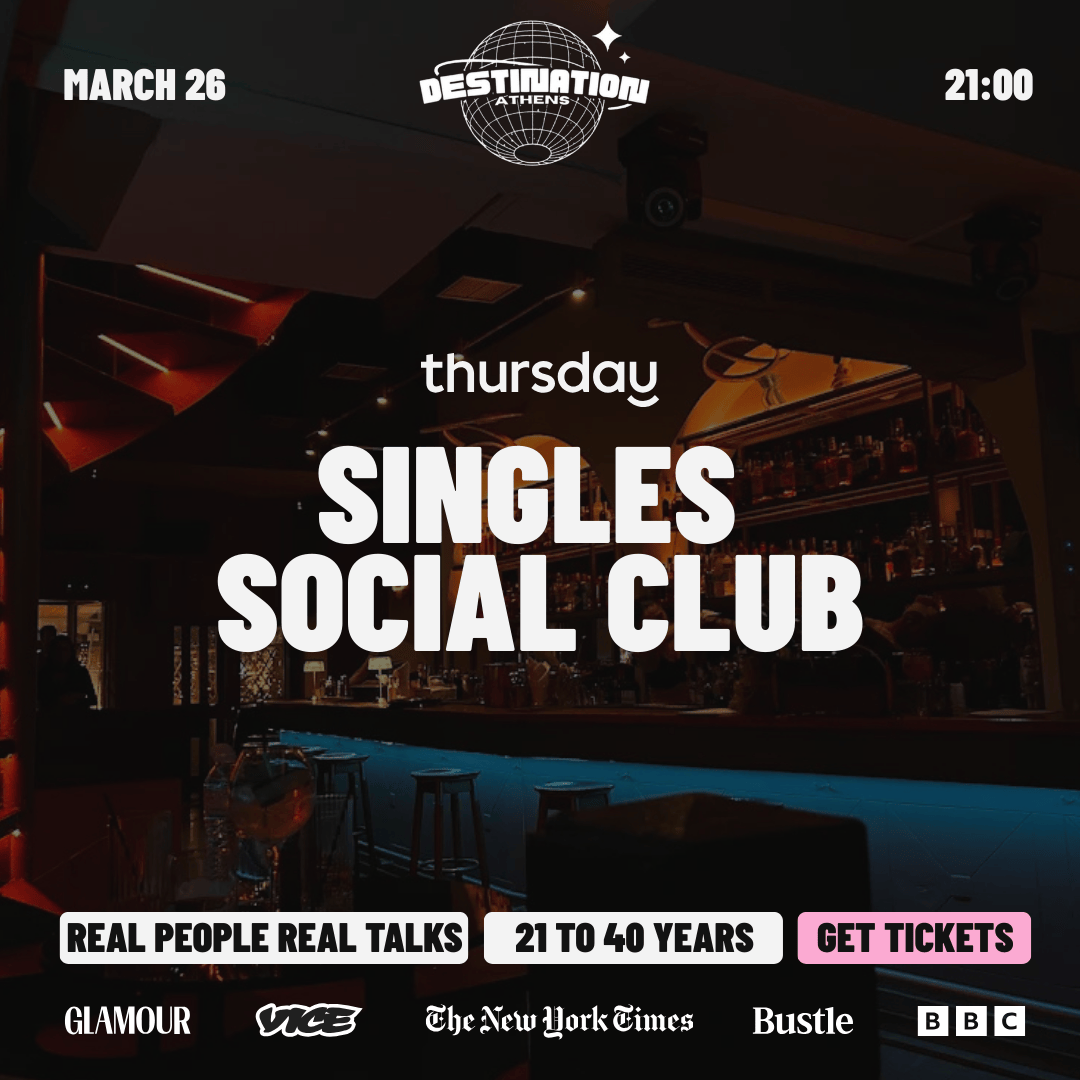 On March 26, we’re taking over Destination Bar in Kolonaki for a very social singles night. Two floors, large space, great sound, and drinks that are worth talking about. We’re welcoming singles aged 21–40 for a night that moves easily between conversations, music, and moments that happen naturally.