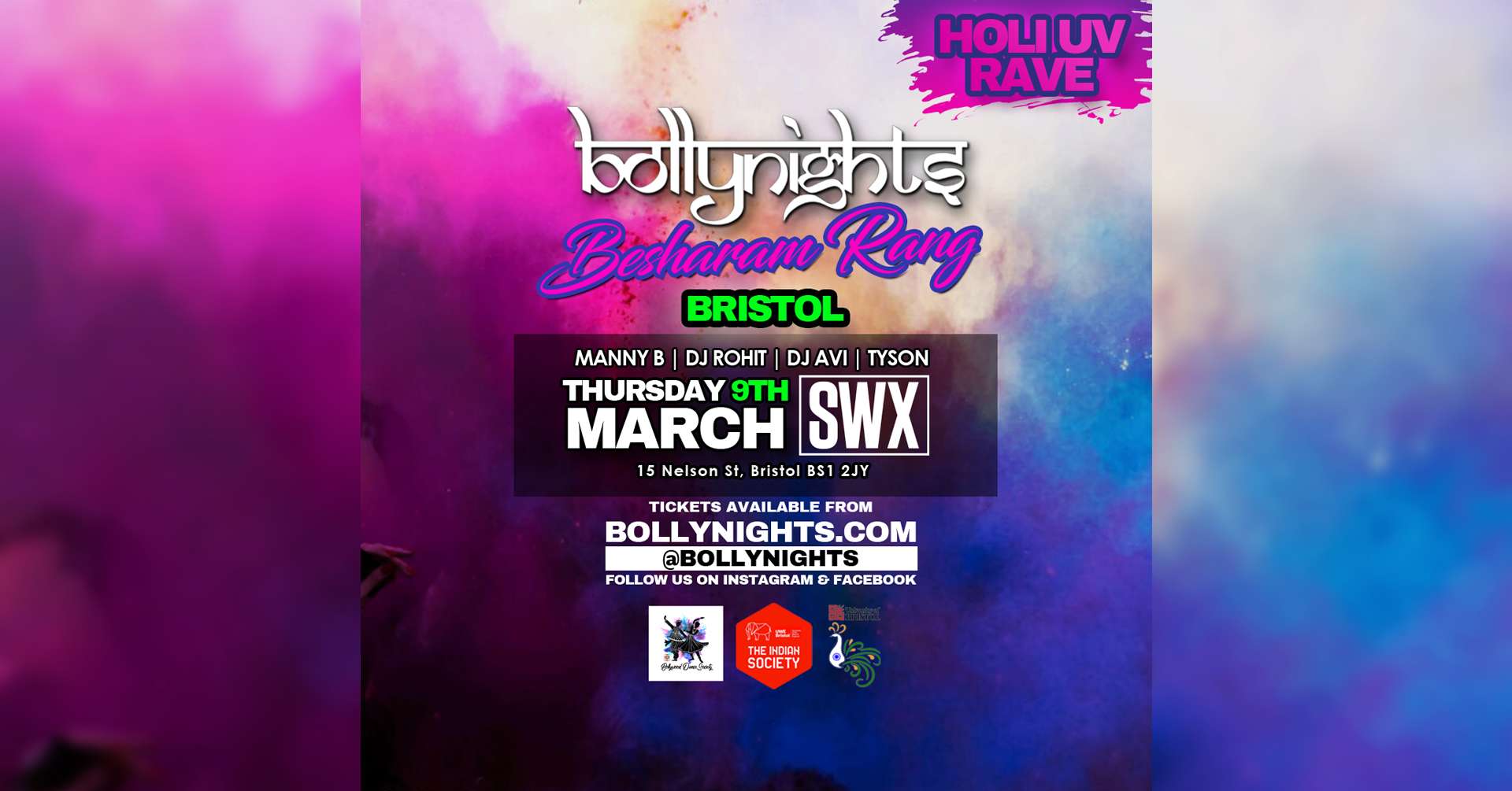 Bollynights Bristol - UK's Biggest Bollywood Night Thursday 9th March! Holi UV RAVE !! will provide glowsitcks and uv colour paint !! Join us at Brand New SWX Bristol for this unmissable night, where the drinks are great, the atmosphere is electric and the party is in full swing.