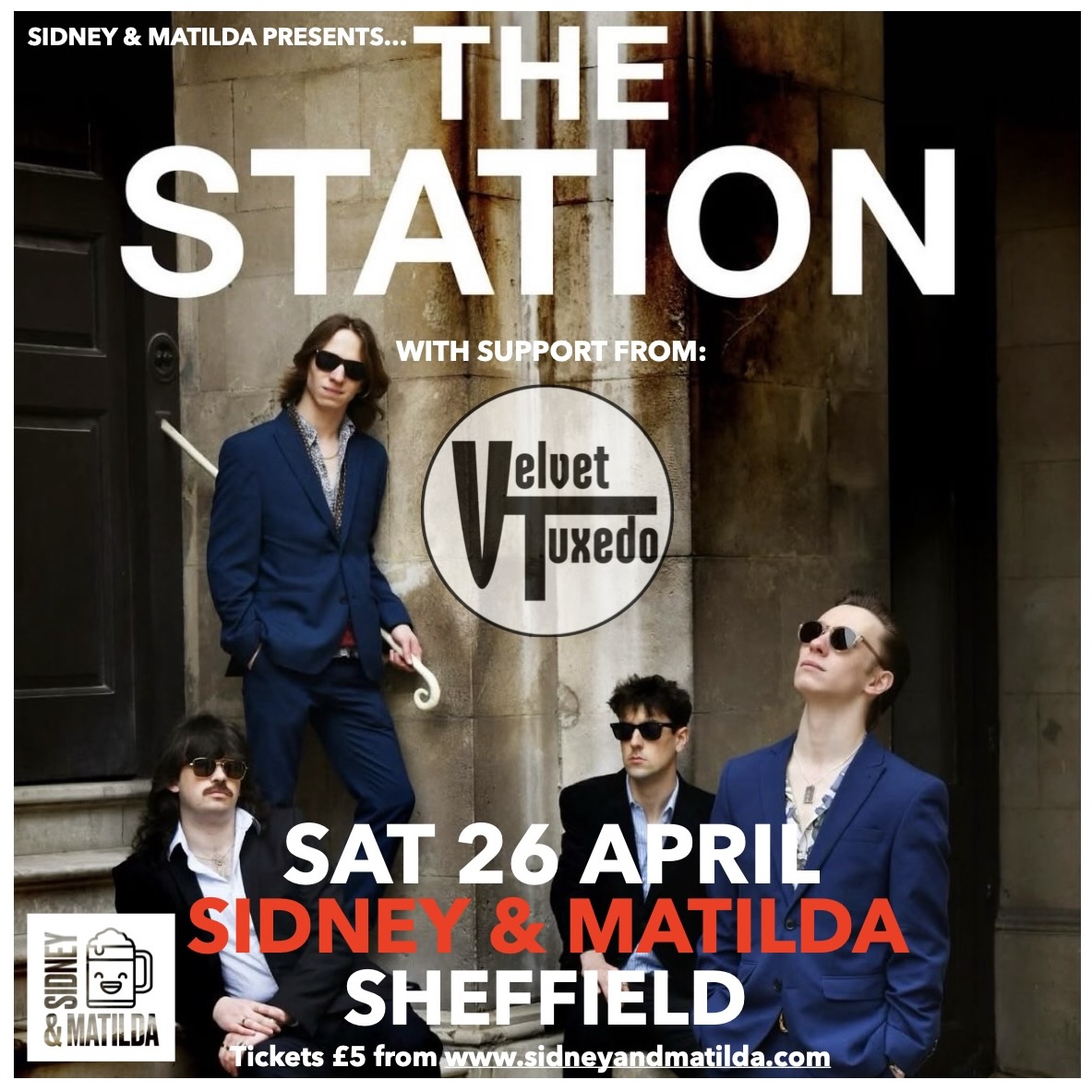 "The Station are the musical equivalent of a light at the end of a tunnel… get illuminated!” On Saturday 26th April we bring a night of the freshest, liveliest rock’n’roll to Sidney & Matilda. Headliners are The Station, with their unique brand of uplifting raucousness and entertaining live show. The Station are "blasting the grassroots scene through the roaring twenties" with their catchy retro originals, reverberating guitar riffs and vocal harmonies - as heard on national radio and in venues up and down the country. Main support comes from the electrifying Velvet Tuxedo, Hull’s exalted garage-psych, freak-beat, R&B outfit who have been exhilarating Sheffield audiences in recent months. Final support to be announced in due course. This is a night not to be missed, join the ride!