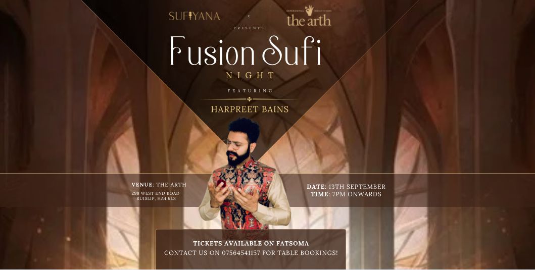 Join us for an unforgettable evening at The Arth as Sufiyana presents a Fusion Sufi Night featuring the mesmerising Harpreet Bains. Immerse yourself in the soulful world of Sufi music, where Harpreet Bains and his band will enchant you with their magical renditions of Sufi songs.