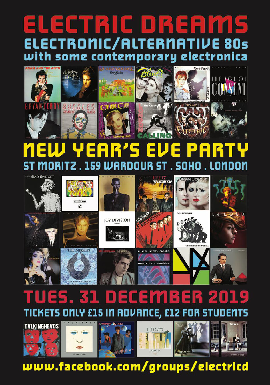 The Electric Dreams crew take you into 2020 with their unique mix of 80s electronic / synth pop / new wave / contemporary electronica including the likes of Depeche Mode, The Human League, OMD, PSB, Duran Duran, Howard Jones, Blancmange, Soft Cell, Adam Ant, New Order, Blondie, Joy Division, Visage, La Roux, Ultravox, Daft Punk, Goldfrapp, etc. etc.