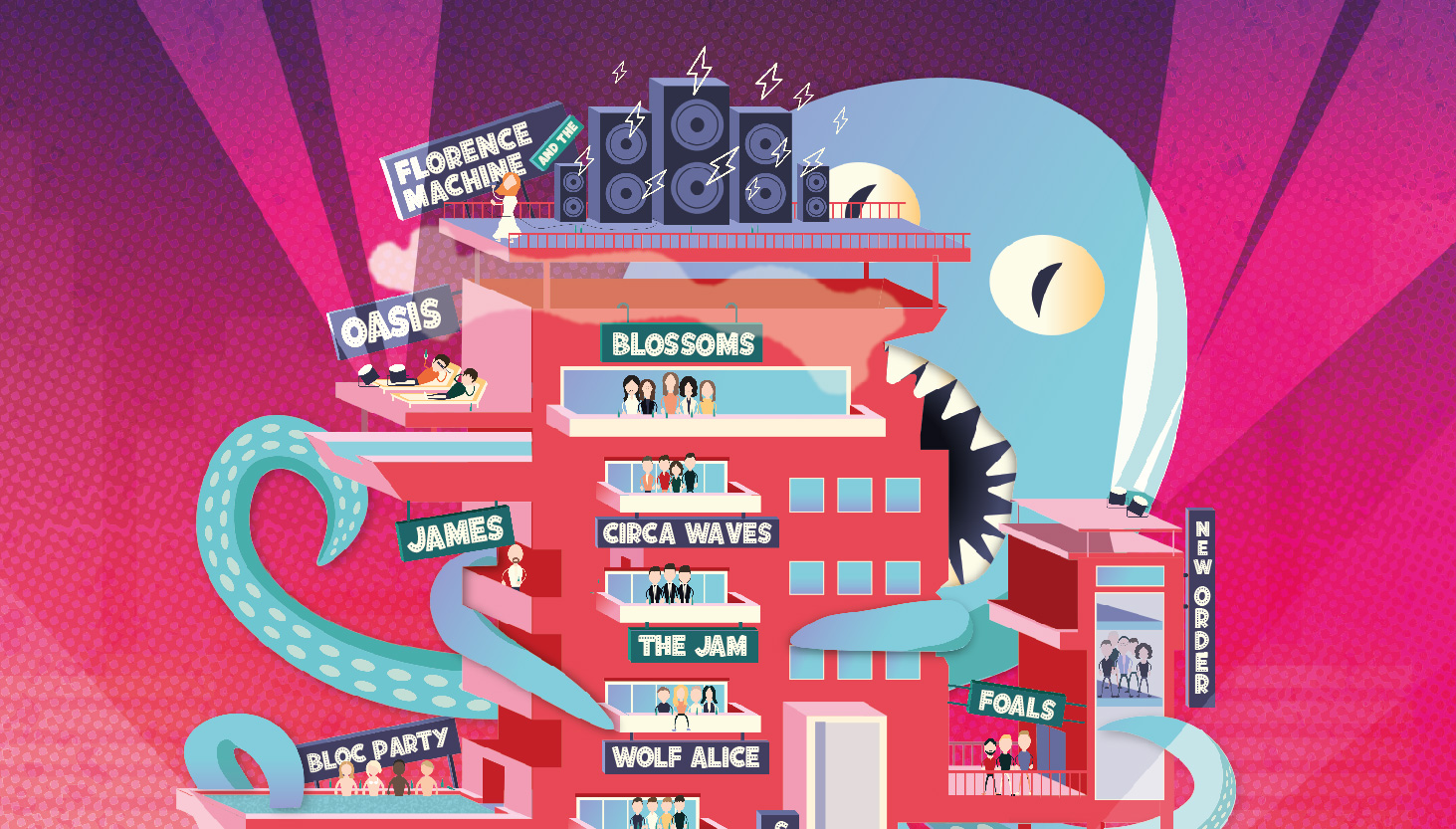 Oasis / Blossoms / Florence And The Machine / James / Circa Waves / The Jam / New Order / Foals / Wolf Alice / Bloc Party / Blur / Catfish And The Bottlemen / Fontaines DC / The Libertines / Sam Fender / Arctic Monkeys / Idles / And Many More