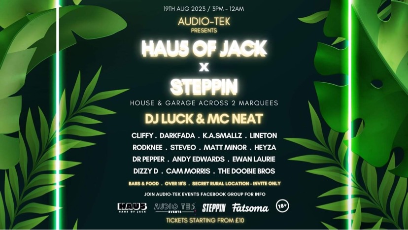 Audio-Tek Events are pleased to bring you yet another incredible outdoor event consisting of quality House and Garage vibes spread across numerous marquees - and this one is red hot with the garage legends DJ Luck & MC Neat headlining for us!