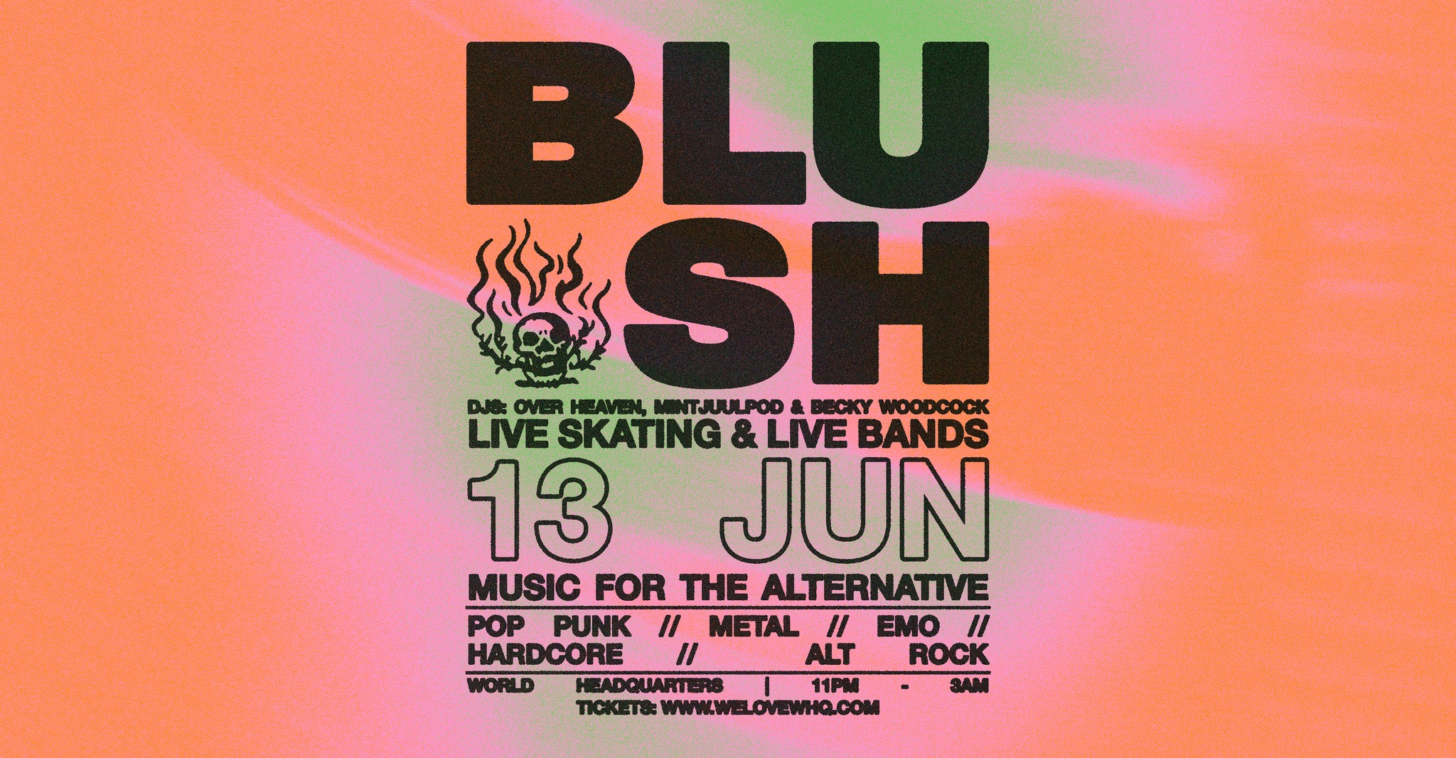 POP PUNK / METAL / EMO / HARDCORE / ALT ROCKLast time out we celebrated one year of alternative parties at World HQ. So we're kicking off another year of Blush and the second Summer of Blush. We'll be throwing down monthly until September keeping things hardcore all Summer long.Our resident DJ's will bring the heavy goodness and singalong anthems and the skate crew will keep the tricks coming in the smoking area.