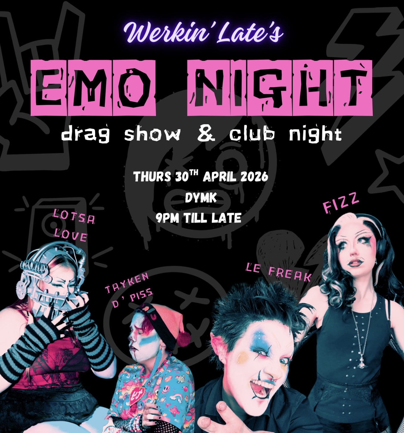 Nostalgic music and references all night, started off with an emo drag show, featuring local drag artists FIZZ, Le Freak, Tayken D’Piss and Lotsa Love. Followed by a club night full of iconic emo and pop punk tunes all night long.