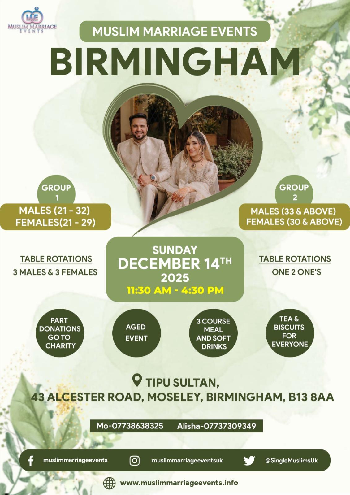 We are holding the next muslim marriage event on Sunday 14th December 2025 at Tipu Sultan, 43 Alcester Road, Moseley, Birmingham, B13 8AA.