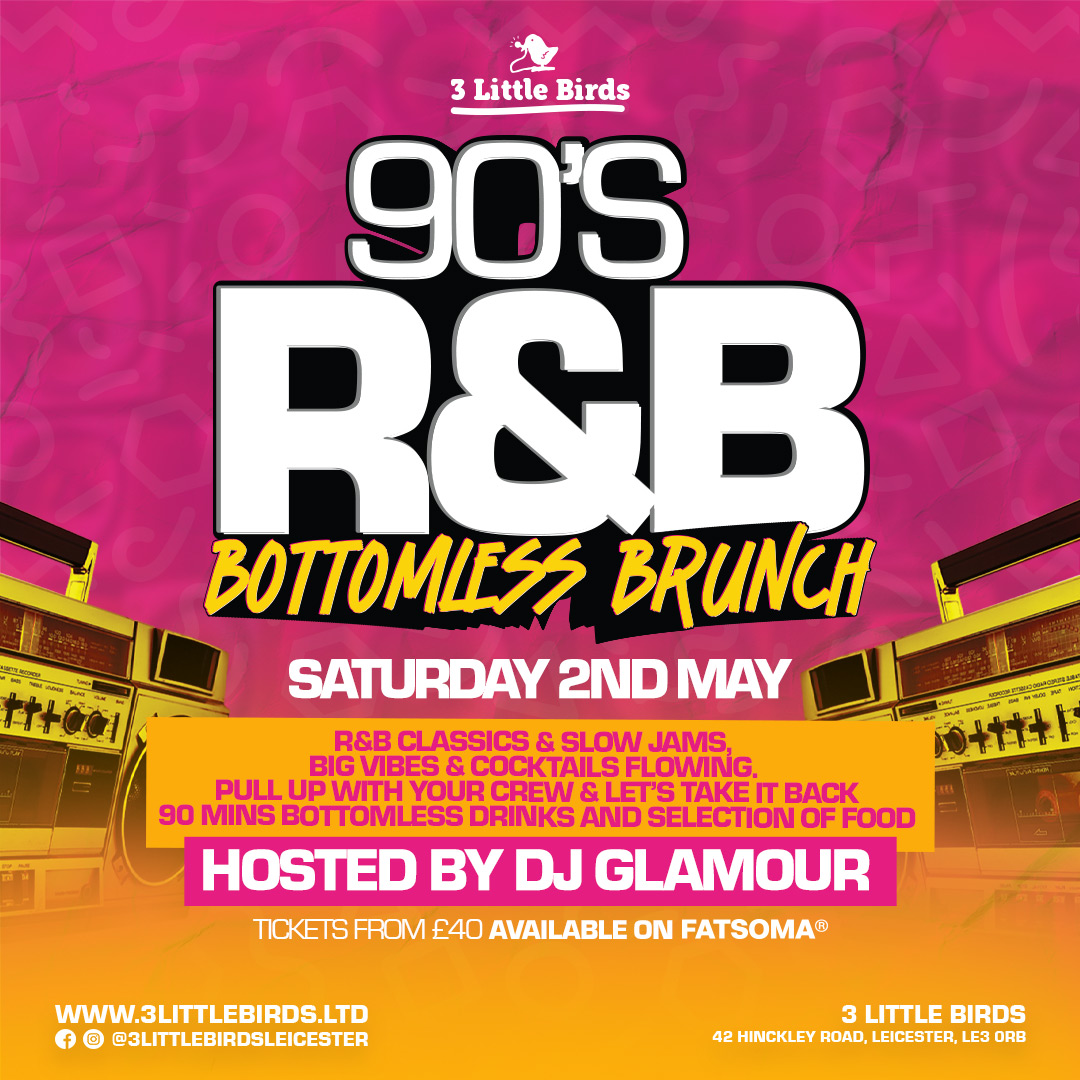 Welcome to the ultimate showdown the 90s R&B Bottomless Brunch**! Join us at 3 Little Birds in Leicester for a day filled with delicious food, bottomless drinks, and the best tunes to groove to.
