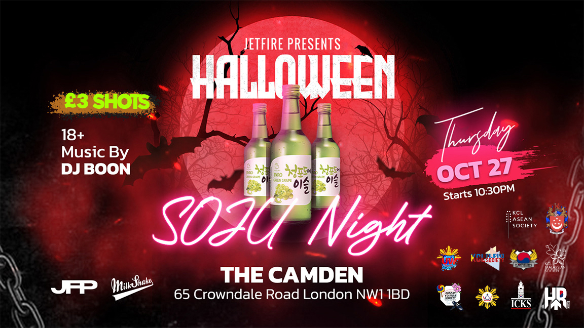 Either way putting the Camden ☄️ production into full practice, JetFire ✖ KCL Hallyu Society ✖ QMUL Filipino Society ✖ UOW Korean Culture Society presents the First SOJU Night Series In The Camden. Expect madness dj sets, halloween decoration + SOJU SHOTS ALL NIGHT LONG until the Next Morning ⚡ !