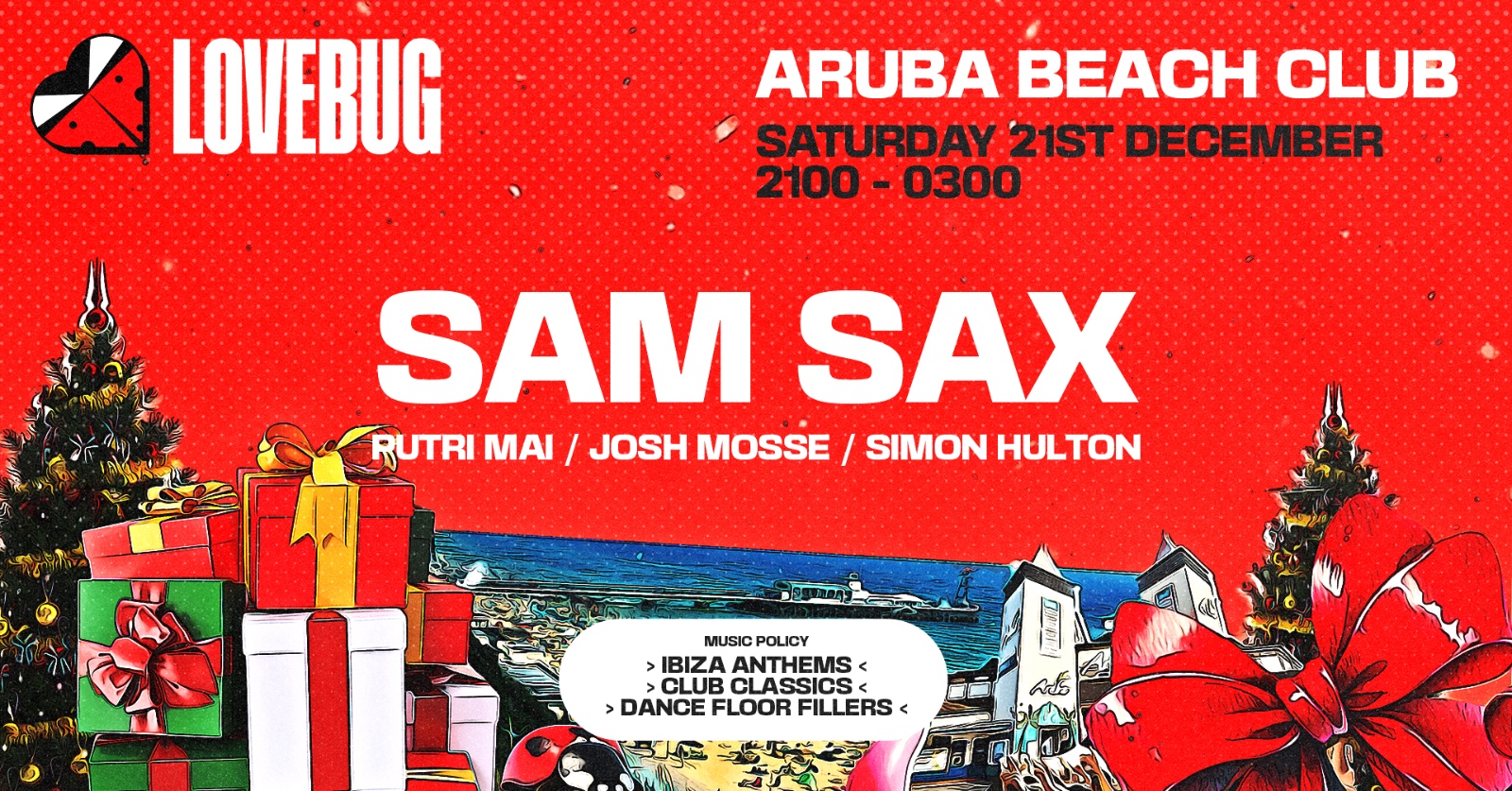 LoveBug lands at Aruba beach club on Saturday 21st December bringing you high energy, multi genre, headliner driven parties that will put the love back into your weekends. Bournemouth's best DJ's Simon Hulton, Putri Mai and Josh Mosse supply a soundtrack of club classics, dance floor fillers, Ibiza anthems and more alongside a very special guest set from 2024's Kiss FM Chosen One DJ competition winner @samsaxuk 🎷🎶