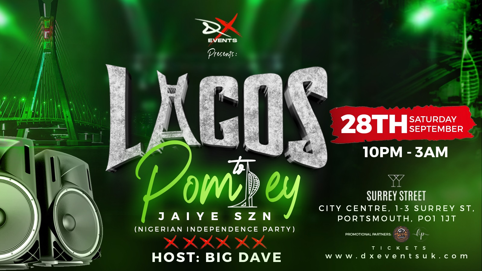 Brace yourself for the ultimate Afrobeats explosion in Portsmouth! "Lagos to Pompey" is not just a party, it's a celebration of Nigerian Independence Day like no other. Happening on Saturday, 28th September at the hottest nightclub on Surrey Street, this is your chance to immerse yourself in the electrifying sounds and vibrant culture of Nigeria, right in the heart of Pompey.