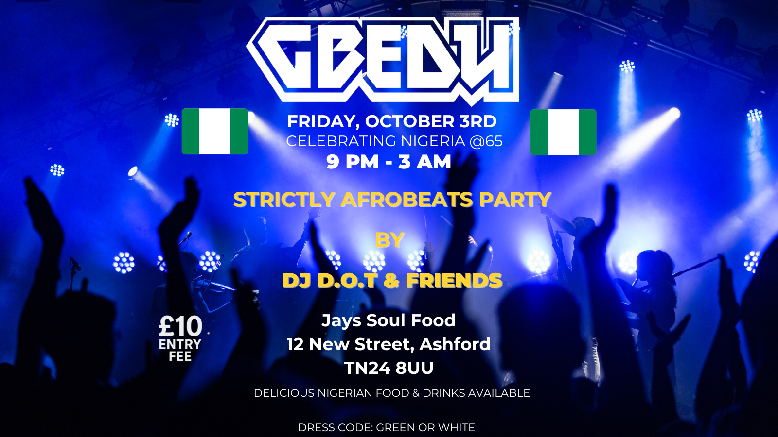 Afrobeats lovers! As you know๐Naija No Dey Carry Last! ๐ - So GBEDU is turning up BIG for Nigeria @ 65 with nothing but pure Afrobeats energy all night long with the GBEDU MASTER @djd.o.t & friends ๐ฅ