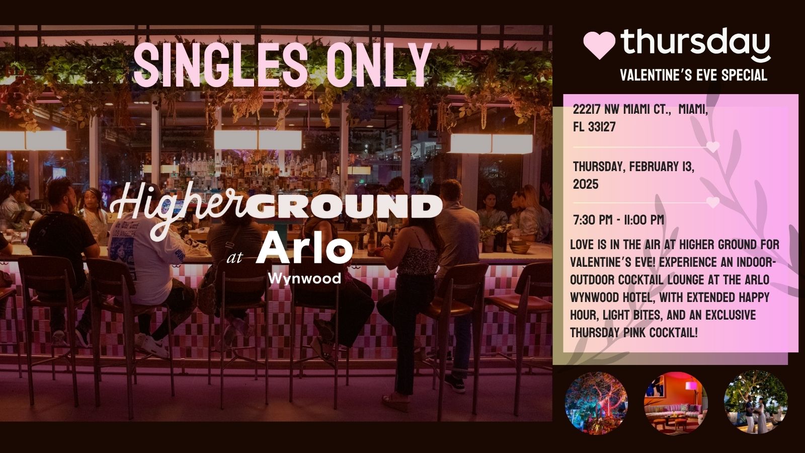 🎉NEW VENUE ALERT🎉 Join us for Valentine's Eve at Higher Ground at Arlo Wynwood–a rooftop cocktail bar nestled in the Arlo Wynwood hotel!