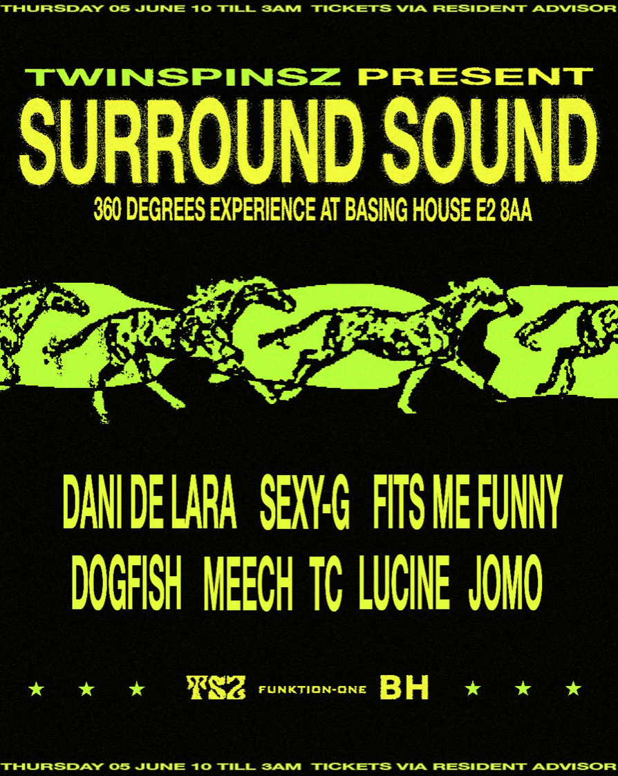 TWINSPINSZ presents SURROUND SOUND On JUNE 5TH we’re stepping it up with our biggest night yet. This is not one to miss. We’re bringing the heat with a full 360° DJ booth setup, next level energy, and our most stacked lineup to date. Expect full immersion, heavy-hitting techno, and a sprinkle of jungle to keep things wild. We’ve levelled up for this one – Basing House is gonna be absolutely shelling it down. Biggest venue, biggest crowd, biggest vibes. Trust us. Here is the lineup featuring finest underground selectors from all round to supply the best tunes all night long: Jomo TC Dinky Dogfish FITS ME FUNNY Meech Sexy-G Dani De Lara Lucine Lock in your spot. We’ll see you there.
