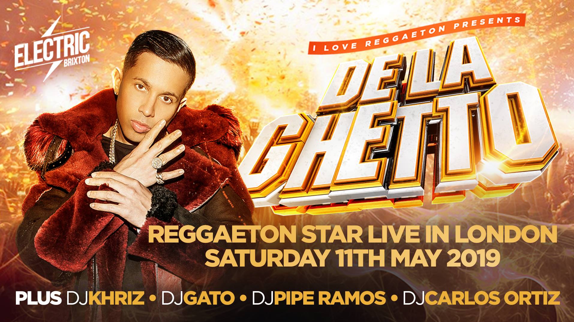 On Saturday 11th May Reggaeton Star DE LA GHETTO will be the first Huge show of our Concert Series hosted at Brixton Electric. This artist is one of the hottest names around having released tracks with Nicky Jam, Bad Bunny, Ozuna, Daddy Yankee & more!