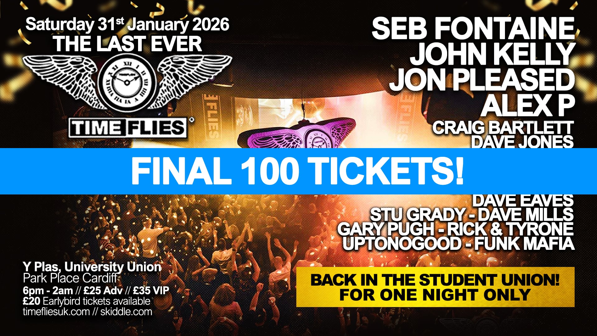 On Saturday 31st January 2026, after 32 glorious years, Time Flies will be bringing the curtain down with one big final party in Cardiff.