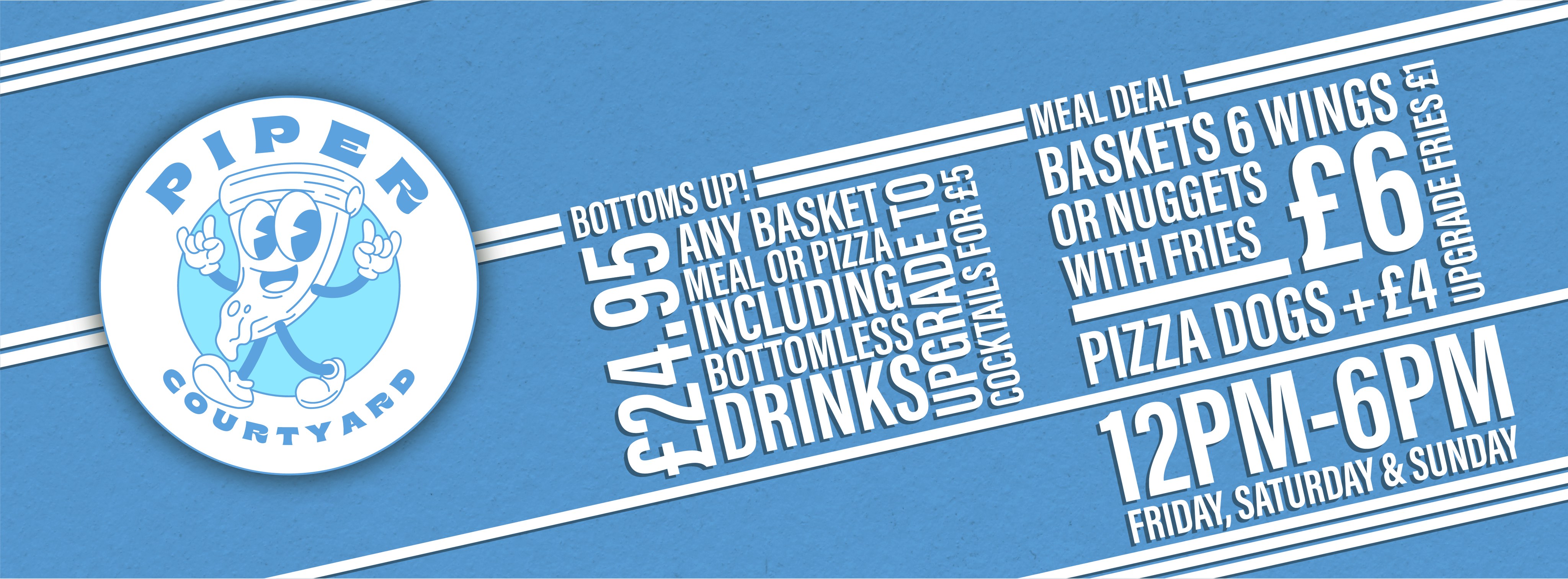 Choose any nugget, wing, pizza dog basket meal or pizza and enjoy bottomless cocktails including;
