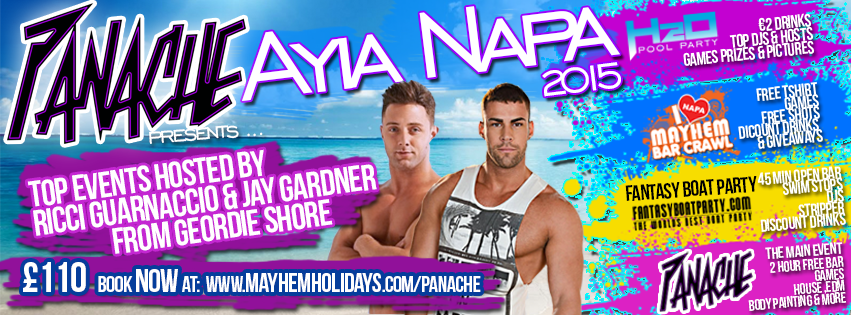 Panache events is a group of events hosted by RICCI and JAY from GEORDIE SHORE. running every two weeks throughout the summer, with Ricci and Jay at every event.