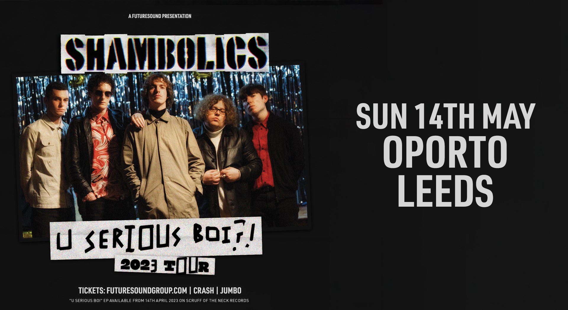 Scottish sensations - SHAMBOLICS - are back with the courageous new single “Living In The Shadows”, and have confirmed details of a new EP: ‘U Serious Boi?!’ (due 14 April 2023). A gentle guitar ballad that erupts into an uplifting acoustic anthem by its close, “Living In Shadows” glistens like a reassuring ray of light at the end of the seemingly endless tunnel of mental health struggles. Arriving as the band announce their signing to Manchester-based tastemaker label Scruff of the Neck Records, vocalist Darren Forbes explains of the new track: “”Living In Shadows” is a song of optimism. It’s a song of hope for anyone going through a dark time. After seeing friends struggle badly with mental health and having gone through a few bad patches in our own lives, we wanted to write a song that was a reminder to people that darkness is only temporary and that there’s always light at the end of the tunnel.” With tender vocals and shimmering guitar strums, the new track seeks to raise awareness for the mental health struggles many face around this time of year — putting a spotlight on real-world issues while refusing to compromise on their usual charismatic charm. Following on from earlier singles “What’s Going On In Your Head” and “Like A Breeze”, the track is the third single to be taken from Shambolics new EP ‘U Serious Boi?!’. Produced by Chris Marshall at 7 West Studios, Glasgow, it’s a dynamic and diverse extended release that sees Shambolics traverse both style and sound — from razor-sharp rock to danceable moments of pop and sleek cuts of retro-tinted indie. The EP is set for release on 14 April 2023 on the Scruff of the Neck imprint. * * * * Hailing from Fife but having recently relocated to the bustle of Glasgow, Shambolics have made a name for themselves on the Scottish scene and beyond with their infamous live performances and impressive knack for a hook-laden single. Making waves with key tastemakers, the band have attracted extensive radio support from the likes of BBC 6 Music, BBC Radio Scotland, Radio X, Talk Sport and more, whilst receiving praise from tastemakers including Clash, Gigwise, Tenement TV, Louder Than War and many more. Having played countless major festivals across the UK including TRNSMT, Stockton Calling and Sound City, while also supporting Richard Ashcroft (The Verve), The View, and Embrace; the band have a reputation for a transcendental live show. “We love experimenting and being creative in the studio,” Darren adds. “But that’s only half the story for us. Our shows are a collective experience, so if a song gets people going mad at a gig then we’ve got a winner.” Playing a homecoming gig at PJ Molloys in Fife in December, which raised over £700 for Kirkcaldy Foodbank, the band are now gearing up for what promises to be another SOLD OUT show in their new stomping ground of Glasgow this April - details below. Further UK live dates are to be announced in due course.