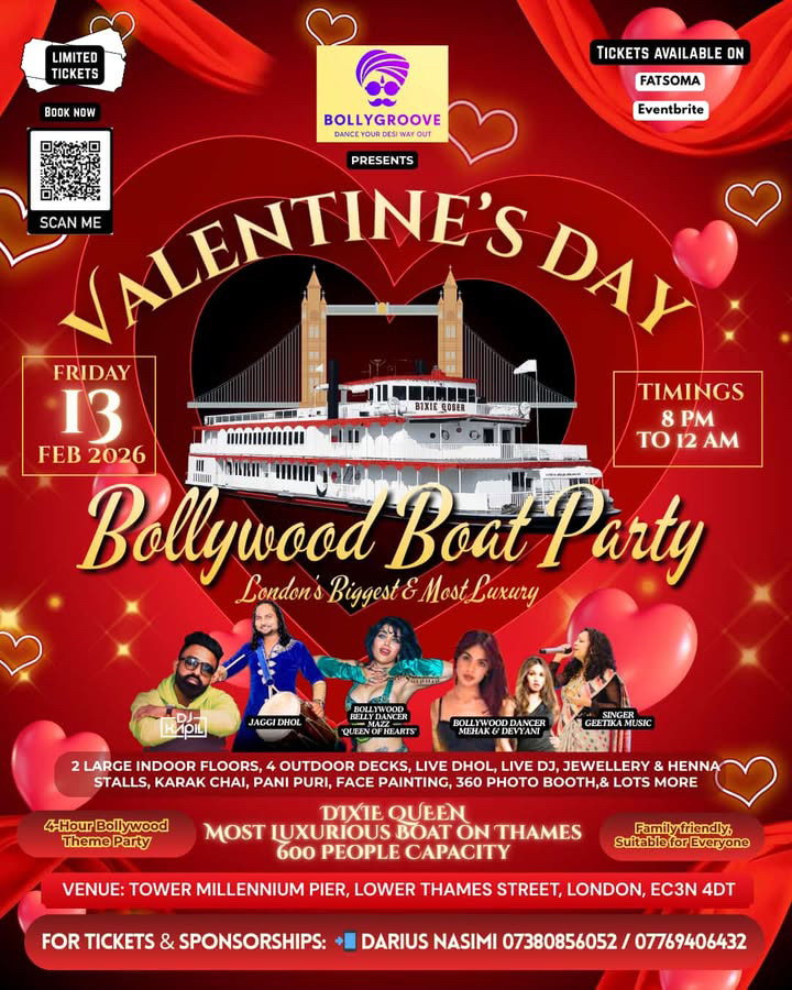 London’s Biggest Luxury Valentine’s Bollywood boat party—DJ, Dance, skyline views, romance on the Thames. Dress up, vibe hard, love louder!