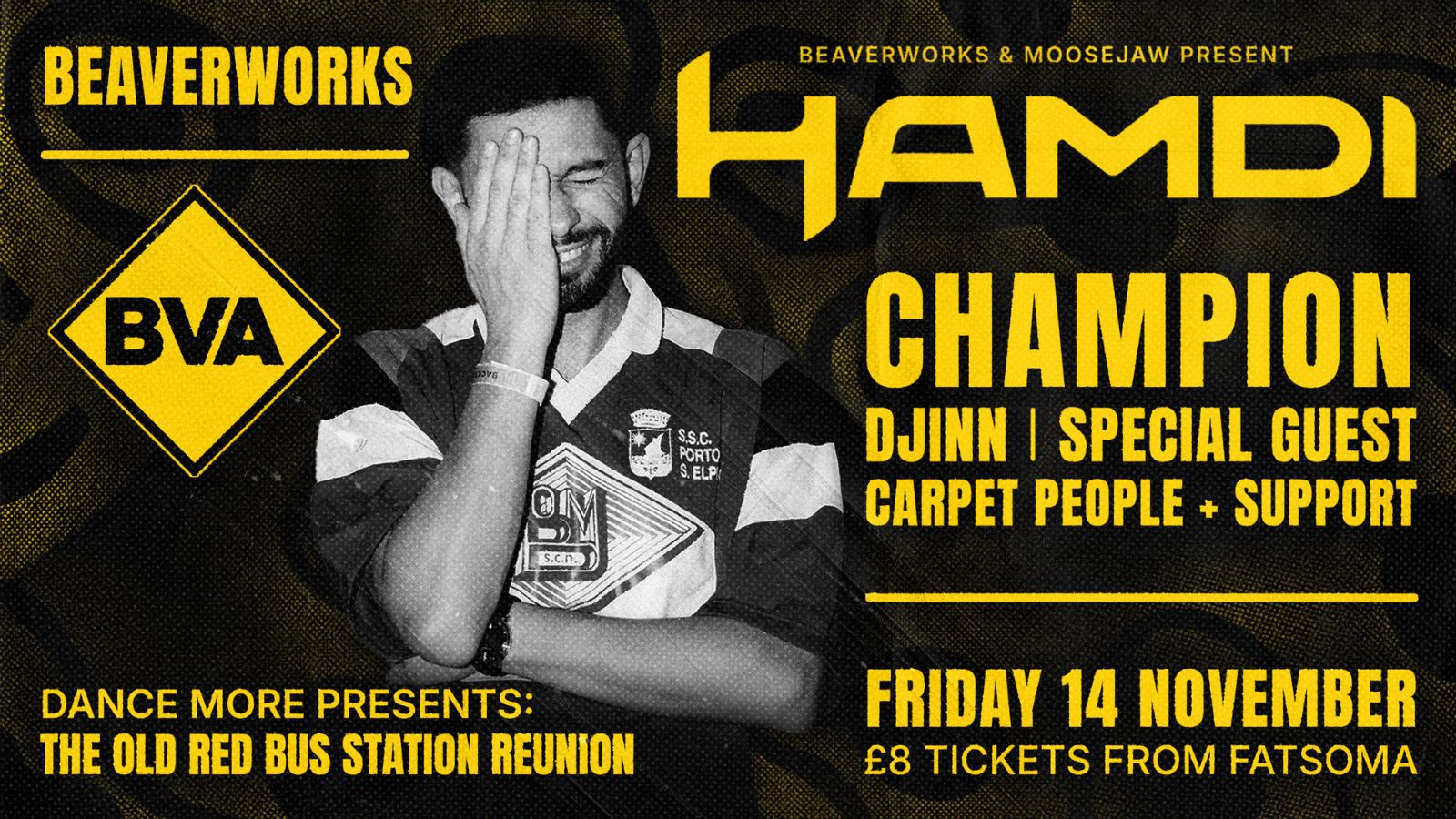 Beaverworks is hyped to welcome HAMDI to our monster new main room with CHAMPION, DJINN + more in tow! Expect big Dubstep, UKG & Grime blends through a big soundsystem with full lighting rigs & mad production. Room 2 is hosted by Dance More as they present The Old Red Bus Station Reunion with sets from all your favourite ORBS residents.