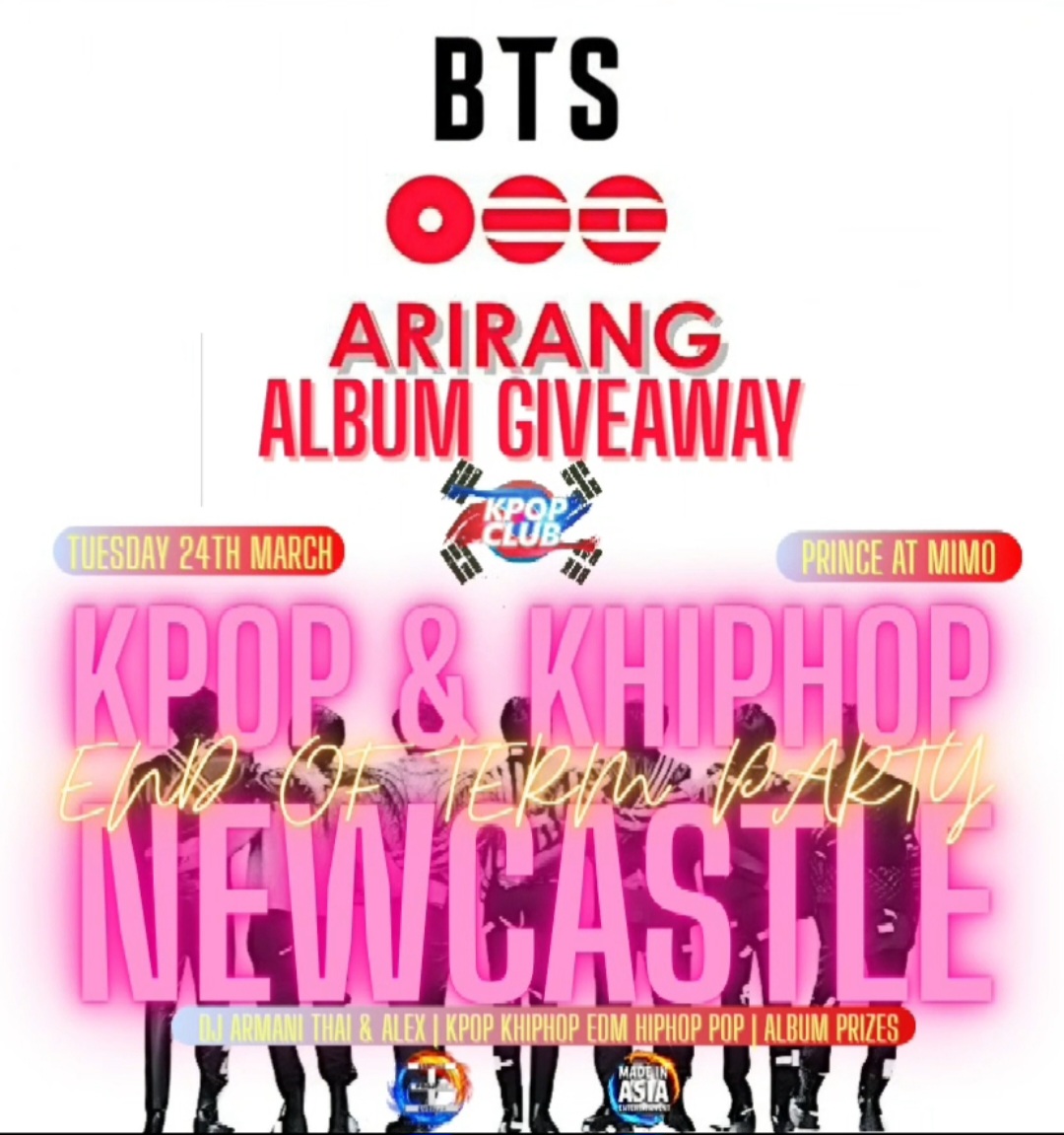 KPop Club BTS Arirang Album Giveaway Party with DJ Armani Thai | Spring Party with NSU and NCL KPop Societies | THE NORTHS BIGGEST ASIAN PARTY | £5 Tickets for Society Members | KPop KHipHop EDM & More | 24/3/26