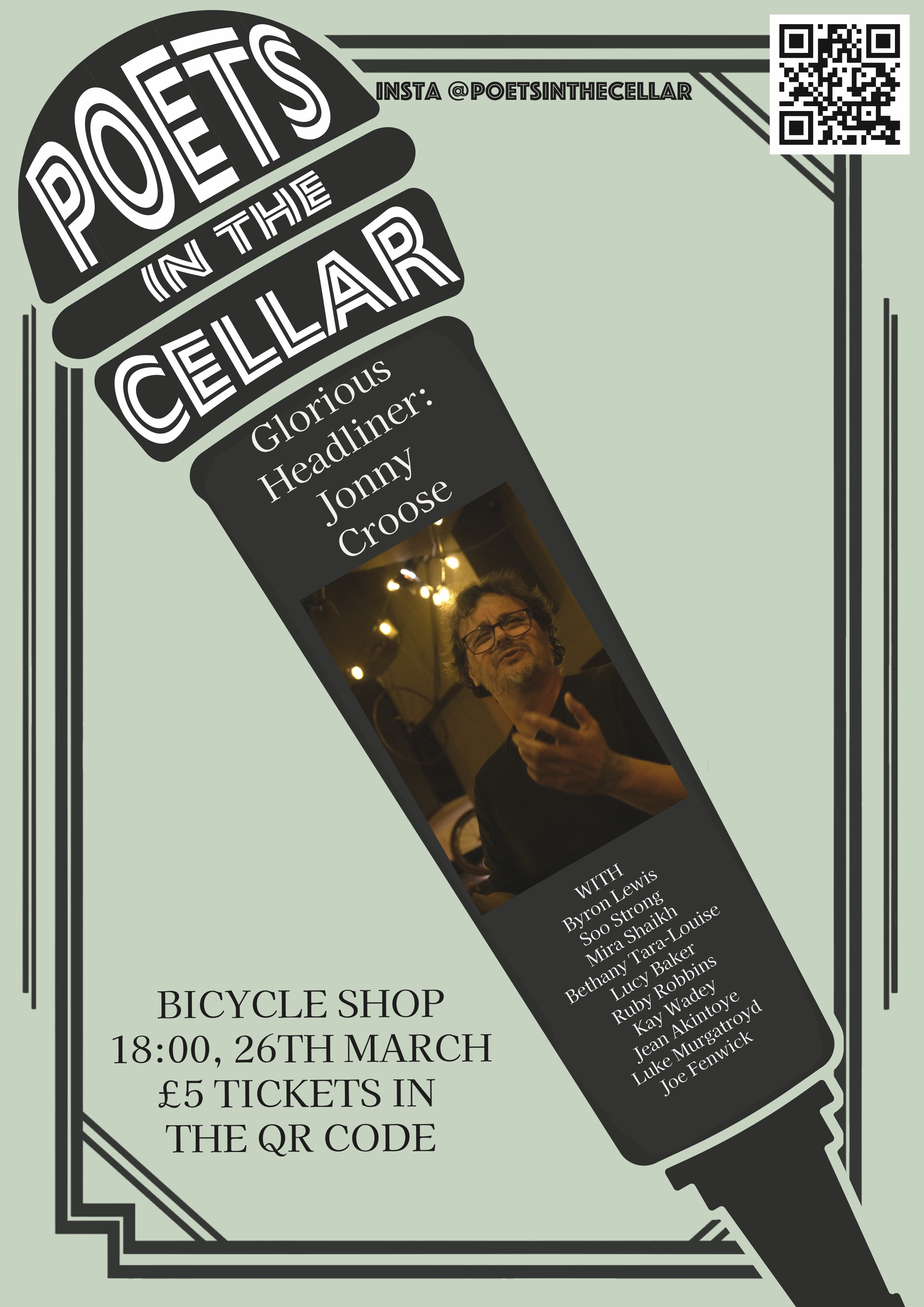 And so we come to another March and another Poets in the Cellar! This month the inimitable Jonny Croose will be hitting the stage as your headliner; if you know anything about Jonny's sets, his is not one to miss! So, grab yourself a ticket and come on down for your usual helping of performance, food and drink, and oh so sweet vibes.