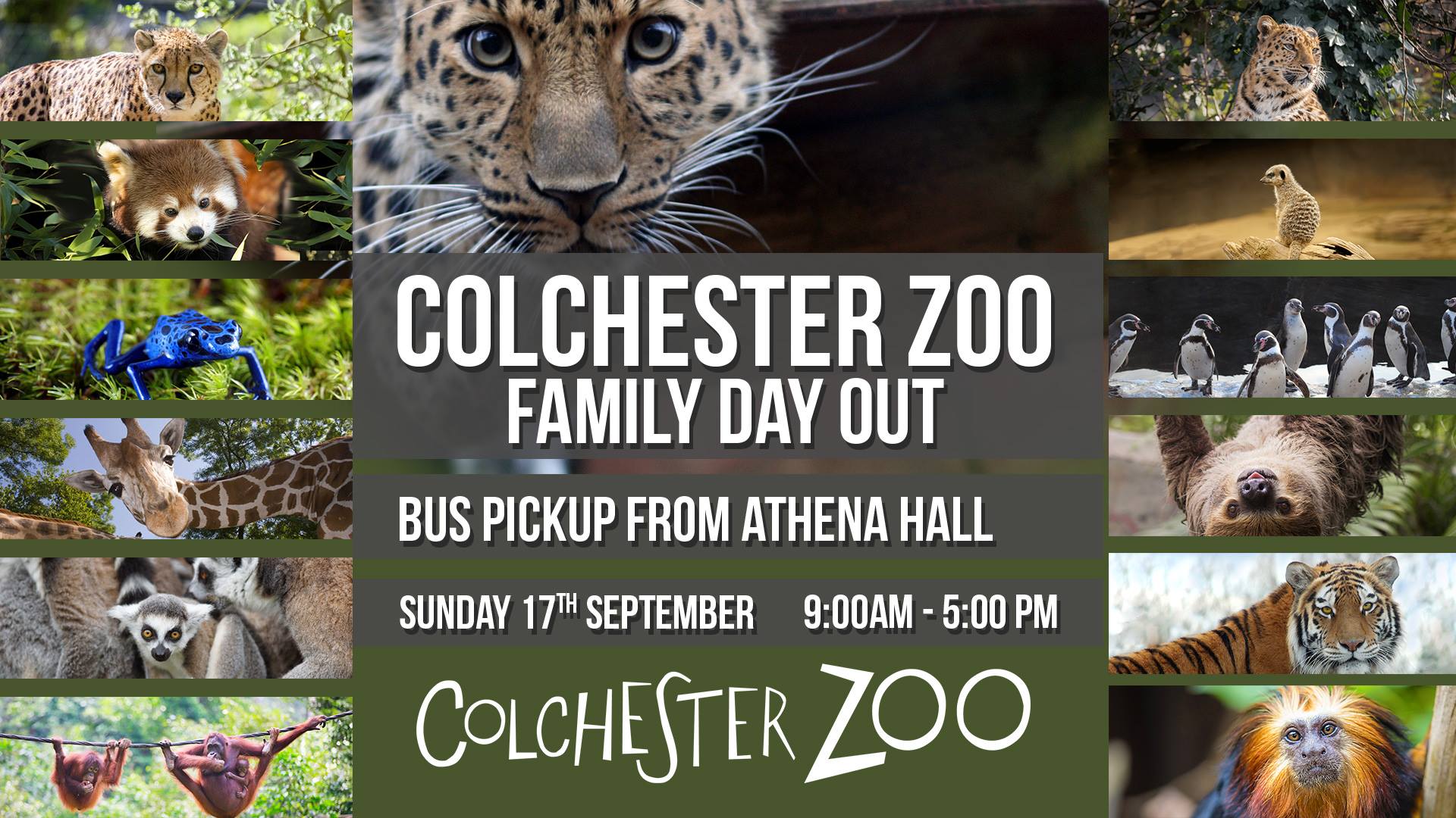 If you are booking transport the bus will be departing from outside Athena Halls at 9.00am promptly and returning from the Zoo at 5.00pm.