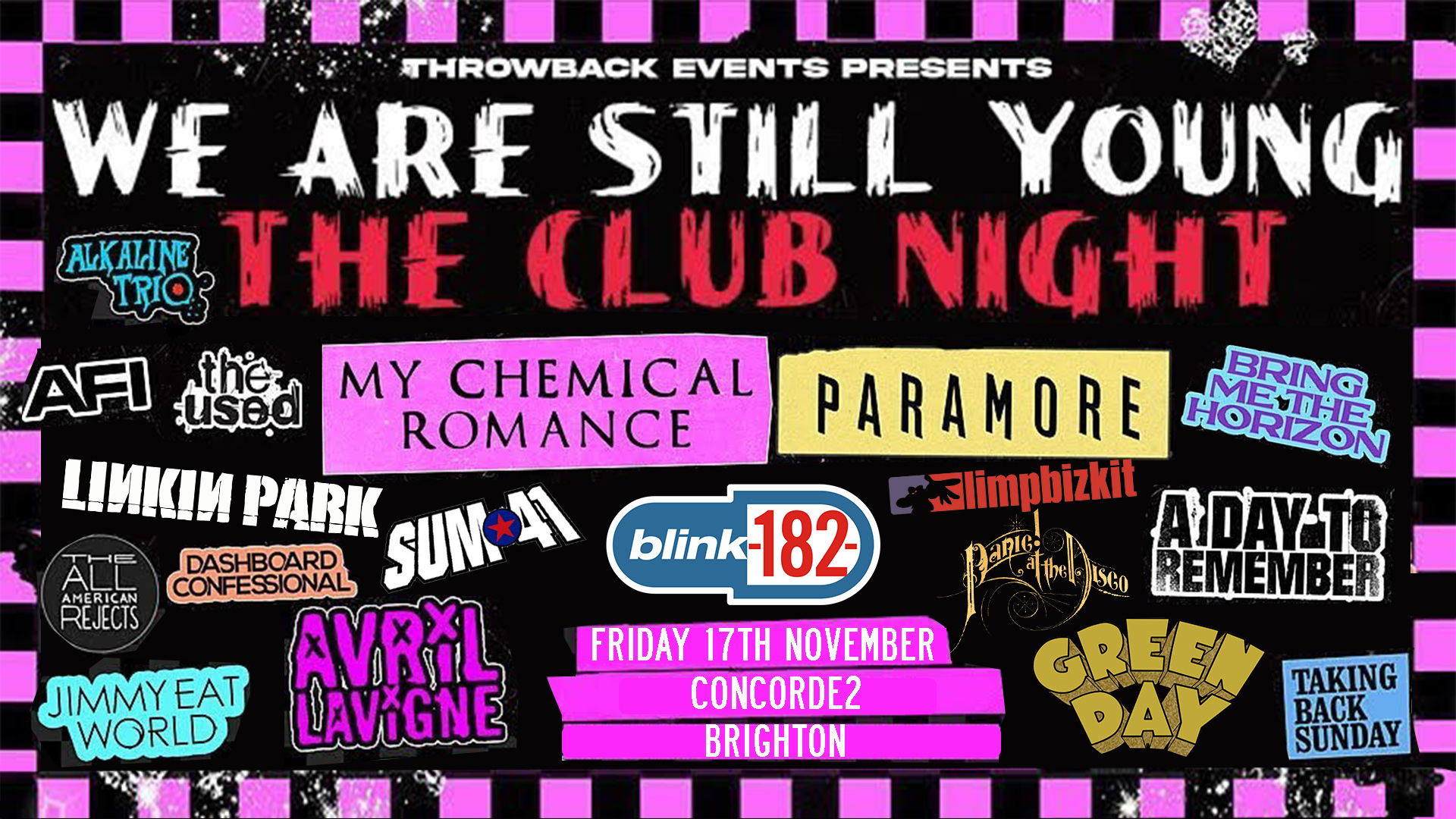 My Chemical Romance / Paramore / Blink 182 / Fall Out Boy / A Day To Remember / Avril Lavigne / New Found Glory / Taking Back Sunday / Beartooth / The Used / Bring Me The Horizon / Say Anything / Dashboard Confessional / Metro Station / AFI / Alkaline Trio / Thursday / We The Kings / Hawthorne Heights / Every Time I Die / From First To Last / The All American Rejects / Sum 41 / Motion City Soundtrack and more.