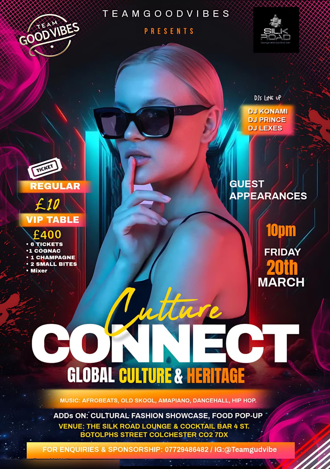 Culture Connect by TeamGoodVibes is a night where sound, style, and stories collide. Bringing together diverse rhythms, global influences, and local energy, this show celebrates culture through music, movement, and shared vibes. Expect an immersive experience that connects people across backgrounds—one beat, one dancefloor, one good vibe at a time.