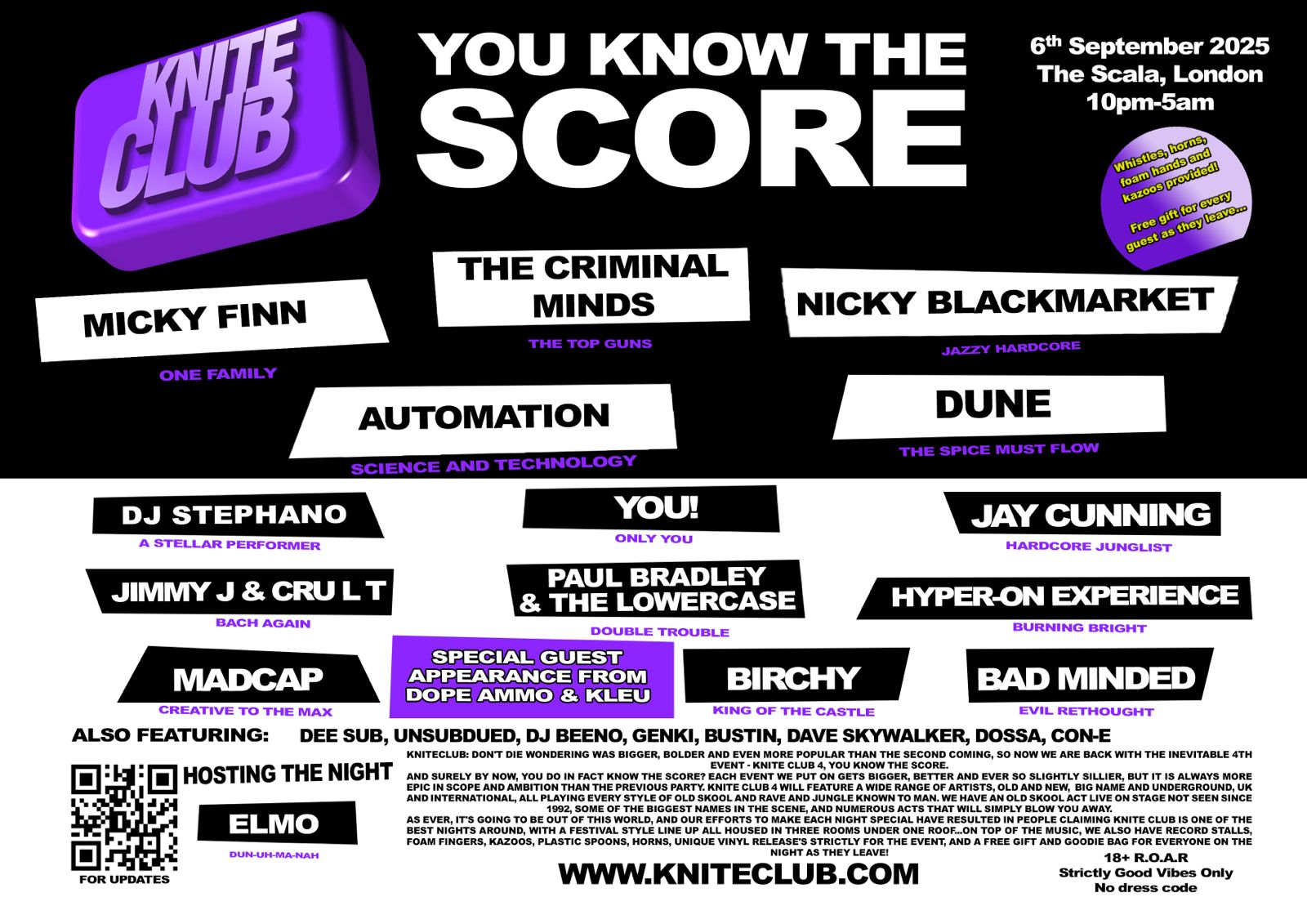 Kniteforce returns to Scala for its yearly event on September the 6, celebrating all forms of old school and jungle from 1990 to the present day. We promise the usual incredible array of headline acts, some of whom havent been seen in decades, spread across three rooms full to the brim with the best people to party with. All this, plus the usual amount of chaos and mayhem, such as a huge Merchandise stall, foam fingers, Kazoos, and all sorts of other foolishness.