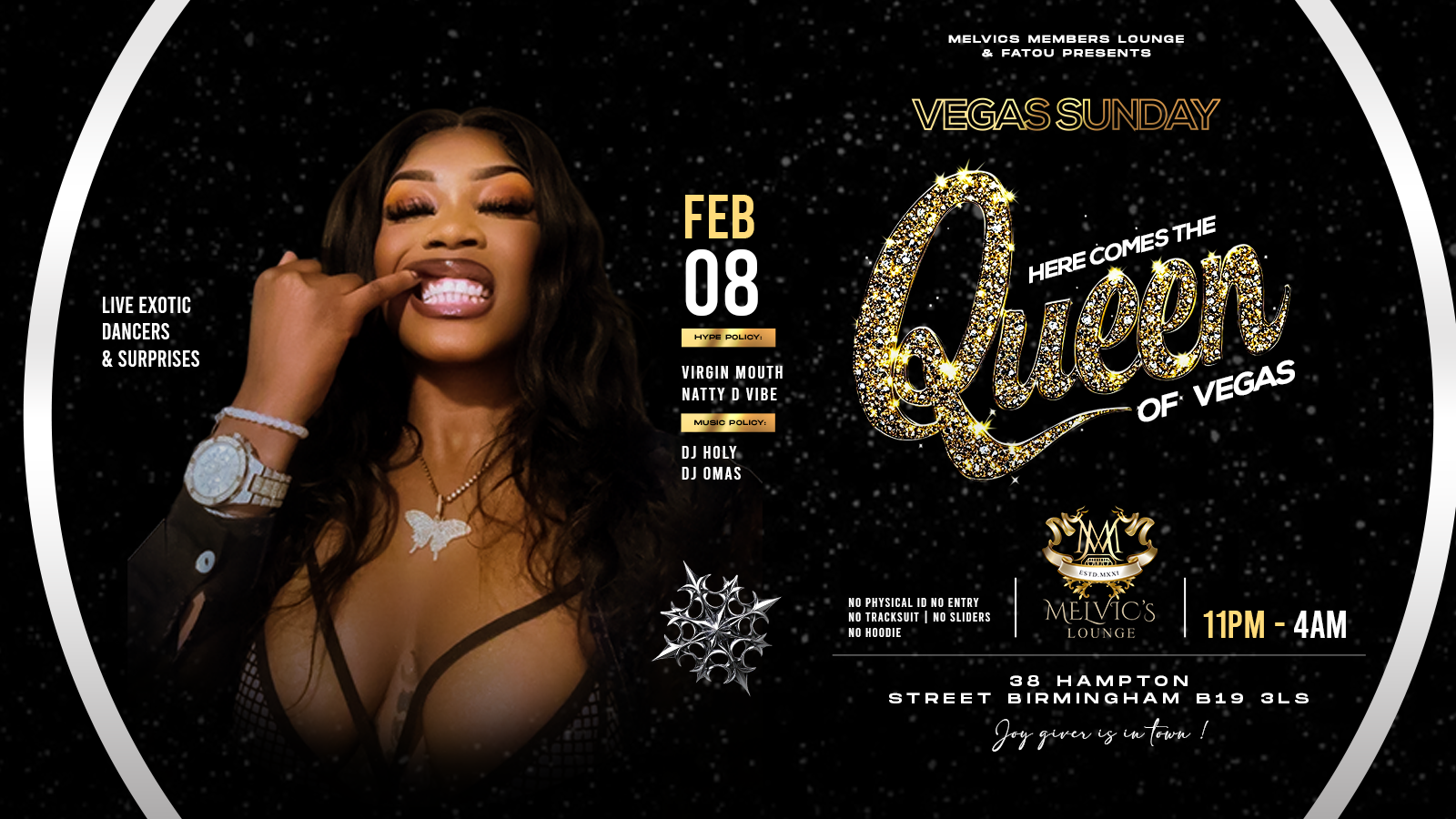 Lights, vibes, and pure Vegas energy at Melvios Lounge this February 8th! Expect live exotic dancers, big DJ sets, and an unforgettable late-night scene from 11PM–4AM. Dress to impress, bring your crew, and step into the Queen of Vegas experience 👑