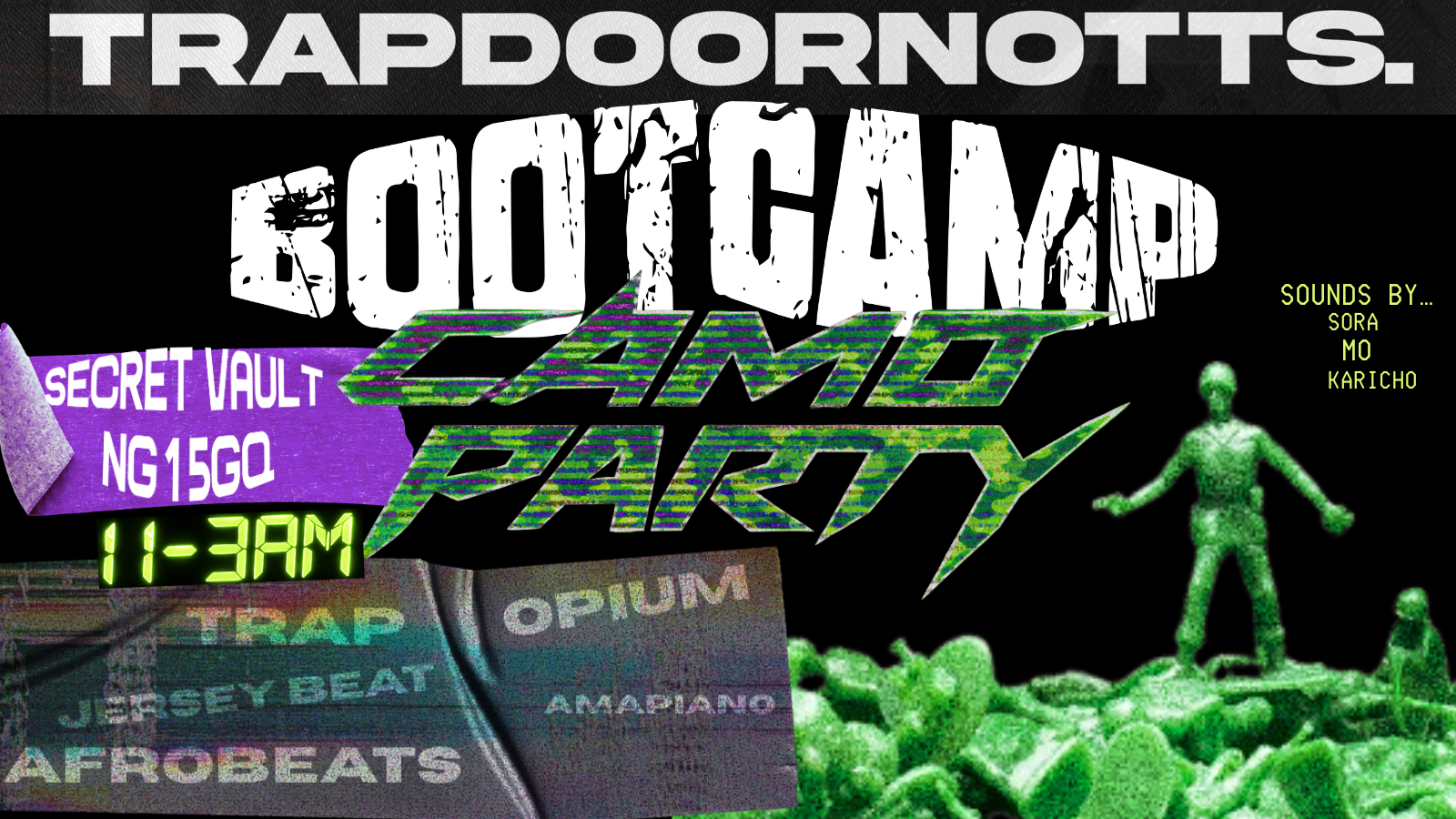 UR FAV GENRES - TRAP UK UNDERGROUND JERSEY BEAT RNB AFROBEATS AND AMAPIANO PLEASE WEAR A CAMO PIECE OF CLOTHING TO THIS EVENT. ANY COLOUR ! (INSPO ON IG @trapdoornotts) 300+ OF YOU WILL BE PARTYING.