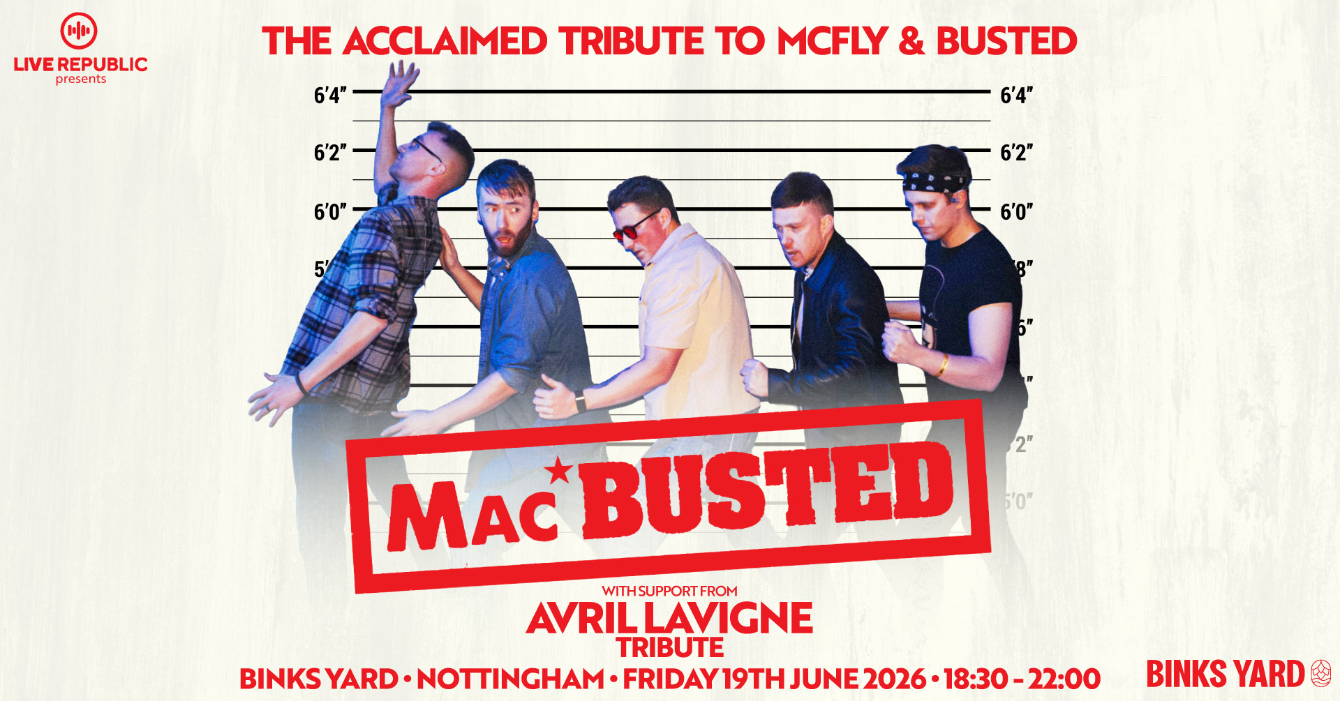 Get ready for a huge night of nostalgia, pop-punk anthems, and sing-along classics as MacBusted brings the ultimate tribute to the iconic supergroup McBusted to Binks Yard.
