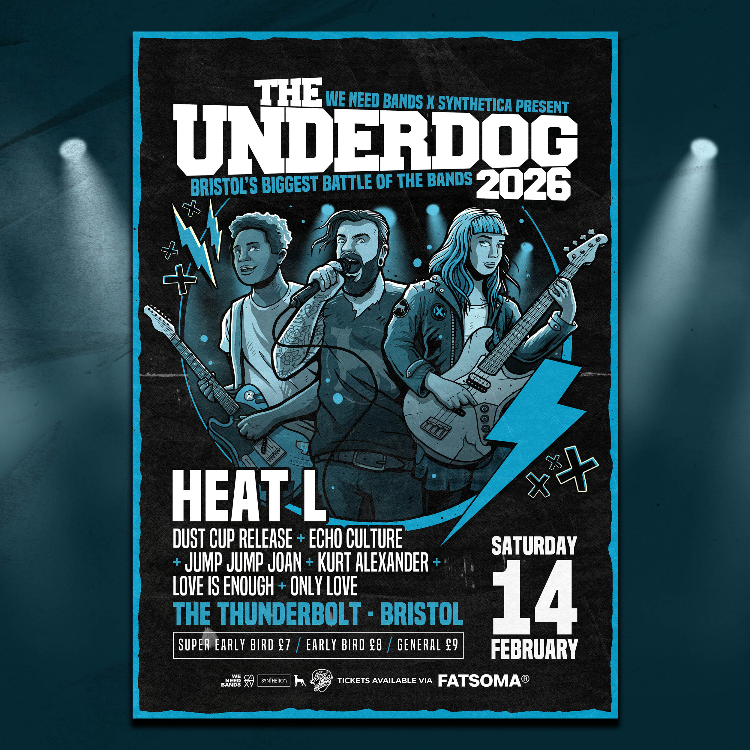 Since launching in 2015, The Underdog has become a Bristol institution — the go-to series for up-and-coming talent and a true alternative to the big-name competitions. Past events have rocked legendary venues like O2 Academy, Thekla, The Fleece, Exchange, The Thunderbolt, and Zed Alley.