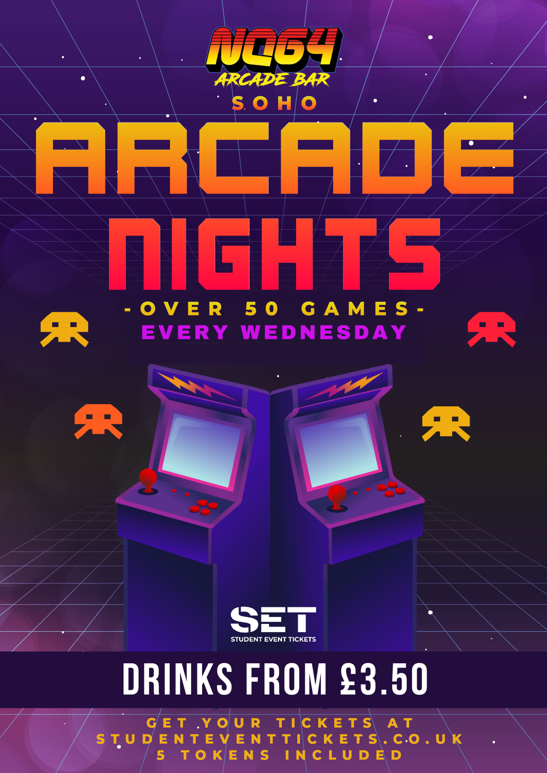 Grab your ticket now for our Arcade Nights at NQ64 Soho! Each ticket includes 5 tokens for games on arrival, and student drink prices all night long from £3.50!🍹