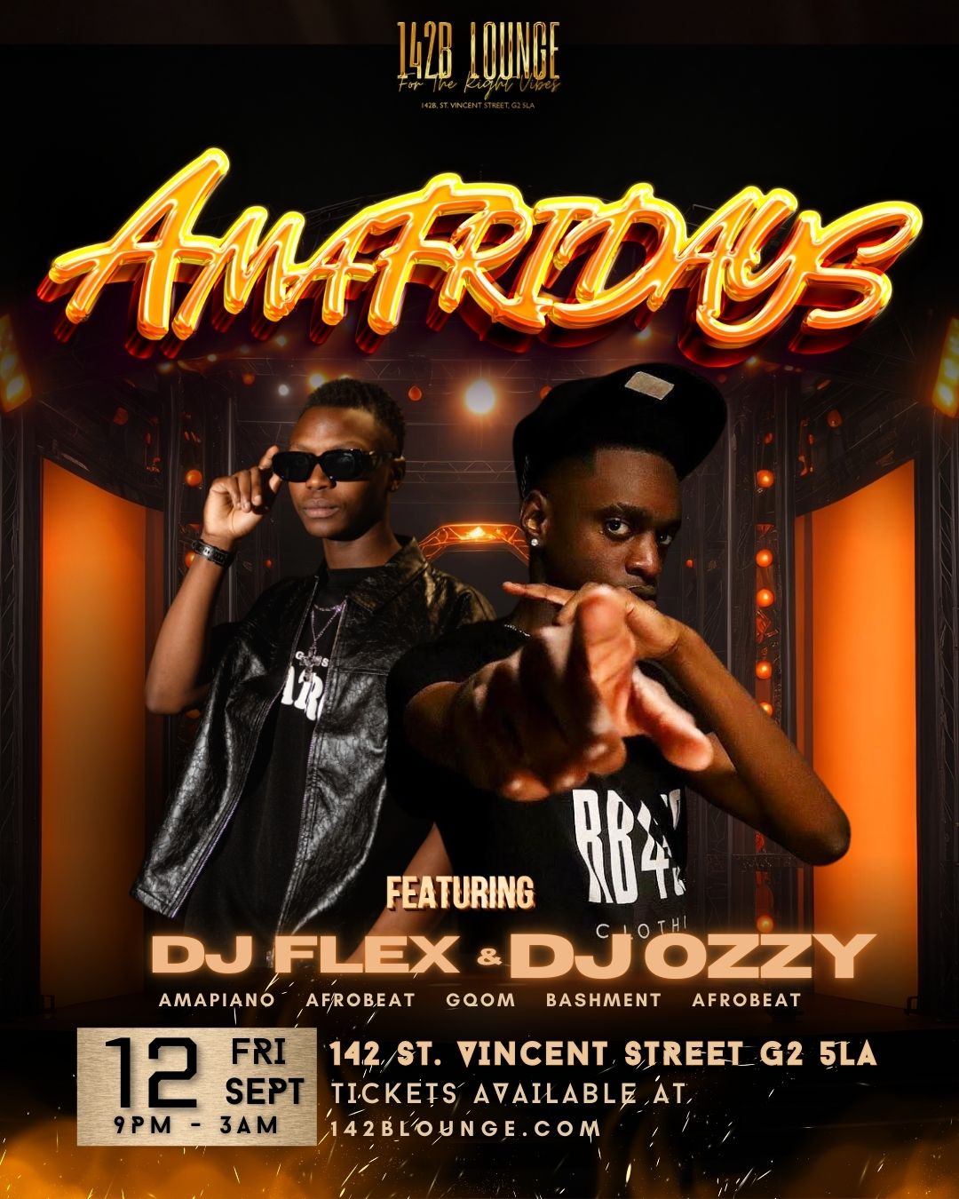 #AMAFRIDAYS #142BLounge #FridayShutdown #DJFlexOnDecks #DJOzzyLive #HypemanG1Live #PianoInvasion #AfrobeatOverload #GlasgowTurnUp #DripOrDip #VibesOverload #AmapianoKings #CertifiedMadness
