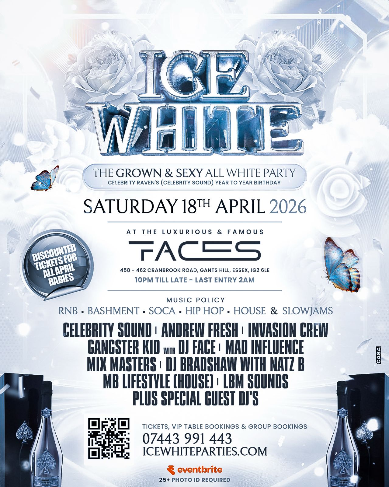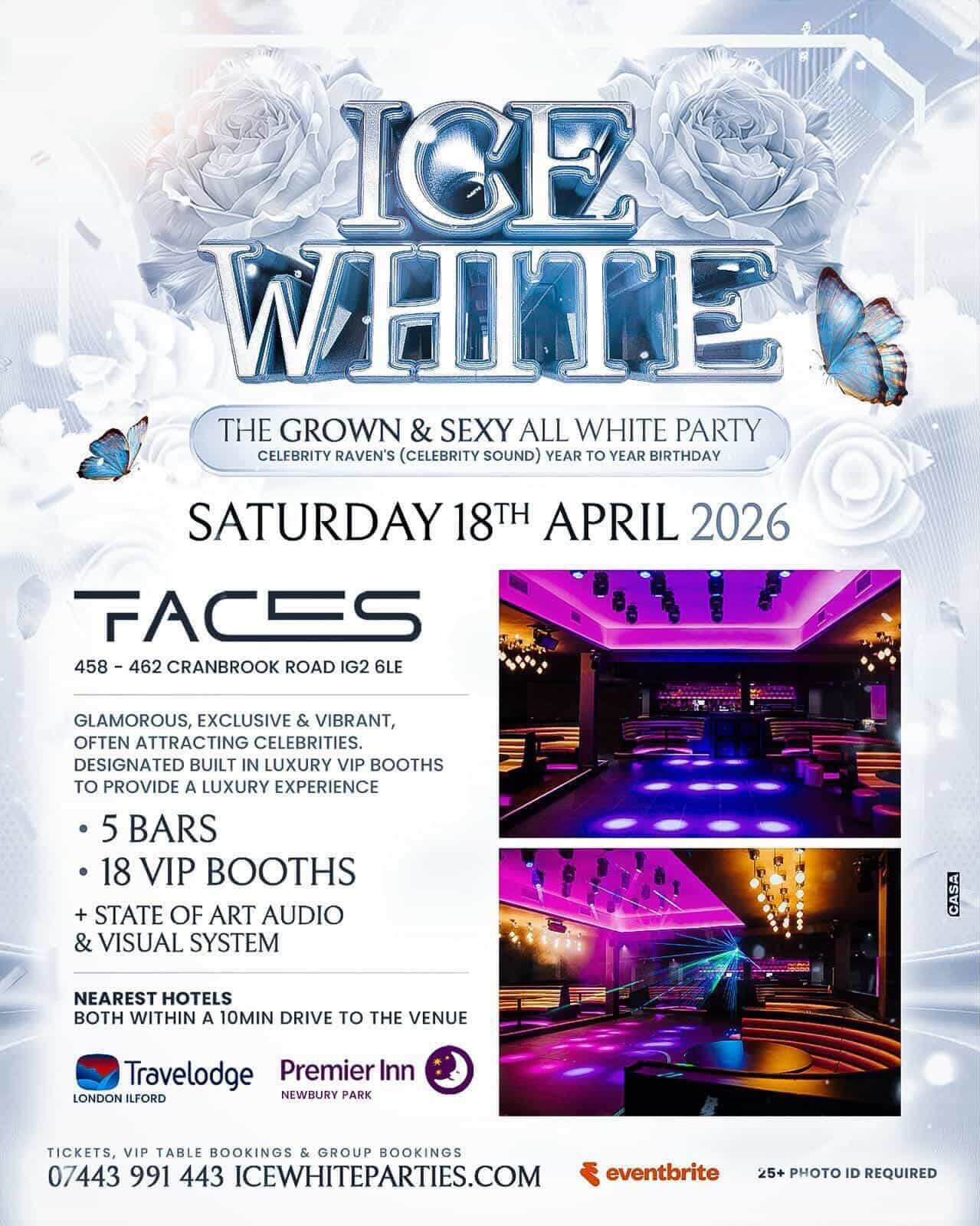ICE WHITE 🧊 .. THE PREMIUM ALL WHITE PARTY LOCATED IN ONE OF LONDONS LUXURIOUS FAMOUS VENUES FACES NIGHT CLUB - GET READY TO INDULGE IN A DECORATED ATMOSPHERE FULL OF CLASS #ICEWHITE On This Night We're Also Celebrating One Of Londons Top Djs - Celebrity Raven's Year To Year Birthday!