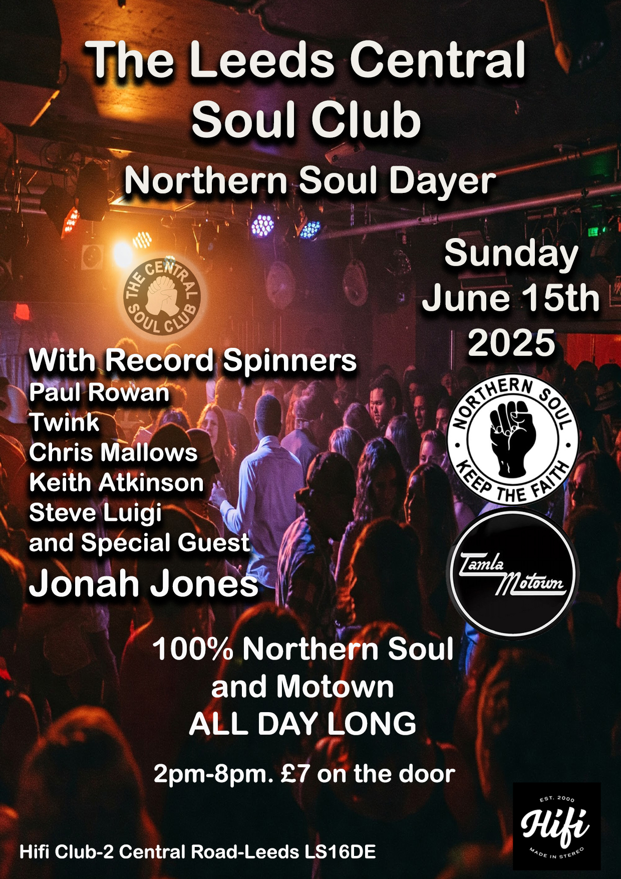 It's getting closer! The Legendary Leeds Central Soul Club Soul Dayer (Established 1971) Sunday June 15th, 2pm start. Expeience what a REAL Soul Club feel like. Huge Sound System, Awesome Dance Floor, Basement Venue = Electric Atmosphere. 5 Resident Record Spinners Paul Rowan Keith Atkinson Steve Luigi Chris Mallows Twink plus special guest DJ, Jonah JonesIt's not JUST a soul dayer, it's The Leeds Central Soul Dayer. Hifi Club Leeds - 2 Central Road, Leeds LS1 6DE