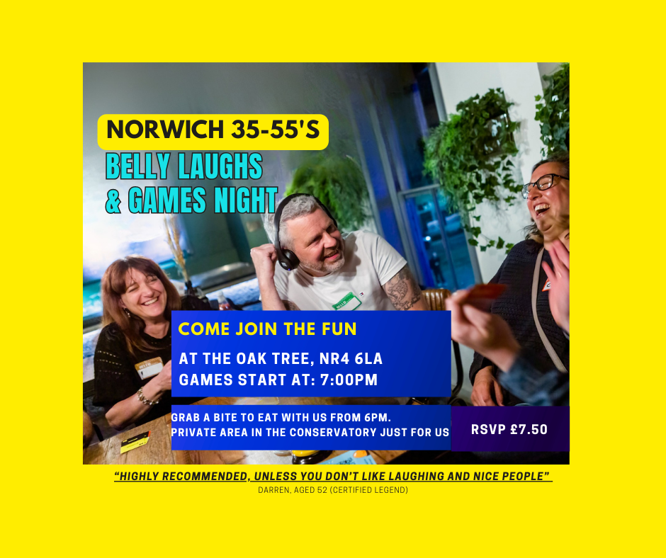 Who says weekends should have all the fun? Join us for a mid-week, laughter-filled, evening at the Norwich 35–55s EPIC Games Night - a 5* rated social evening full of cheeky challenges, questionable team names and the kind of belly laughs you’ll still be giggling about days later!
