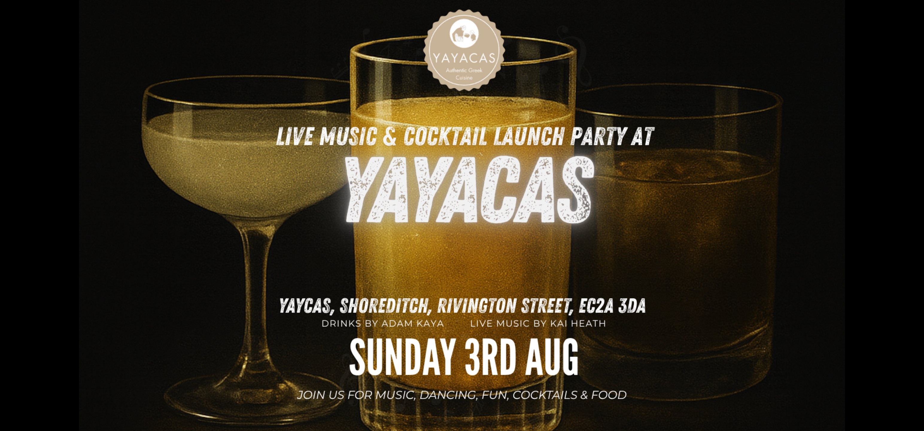 We're launching our brand new cocktail menu designed by Adam Kaya featuring exciting creations — including a few with a Greek flavour twist — and you're invited to sip, savour, and soak up the vibes. From 7pm to 9pm, enjoy live music from Kai Heath featuring iconic hits from the 90s and 2000s, performed in our beautiful setting.