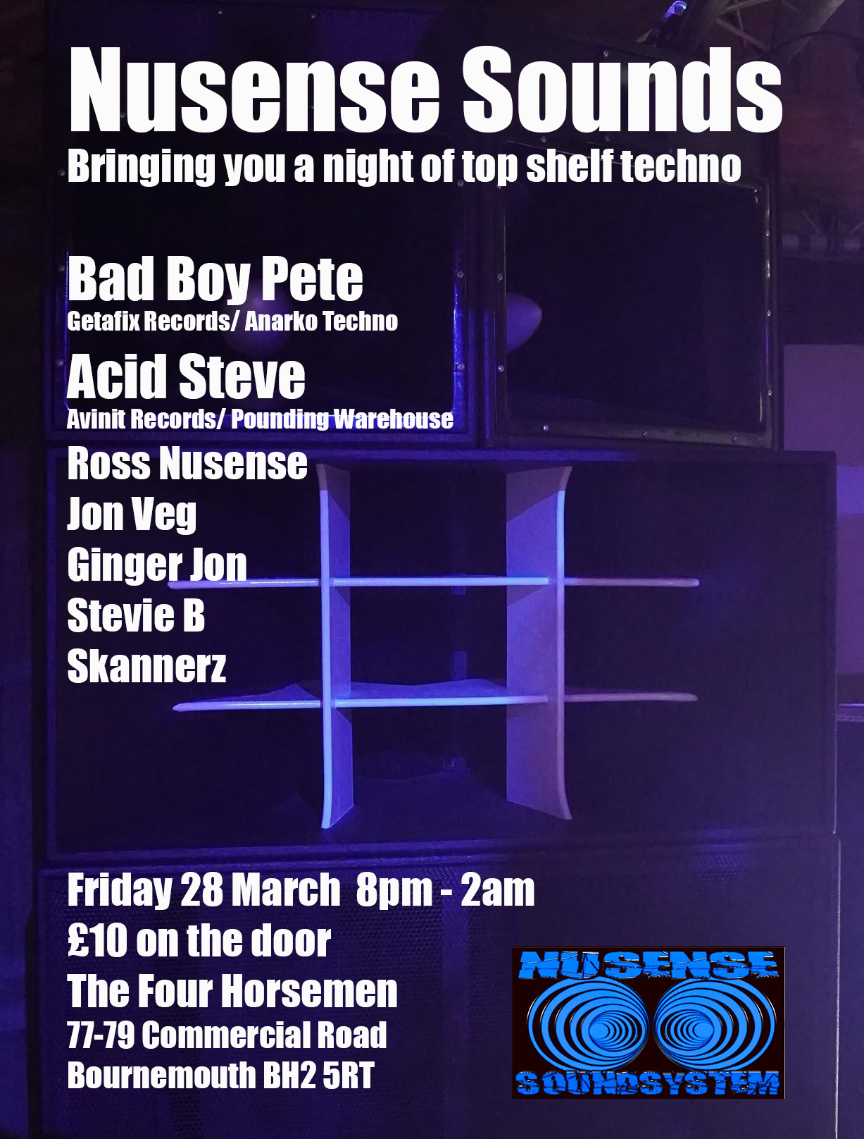 Nusense Sounds are bringing you a night of top shelf techno including:Bad Boy PeteAcid SteveRoss NusenseJon VegGinger JonStevie BSkannerz