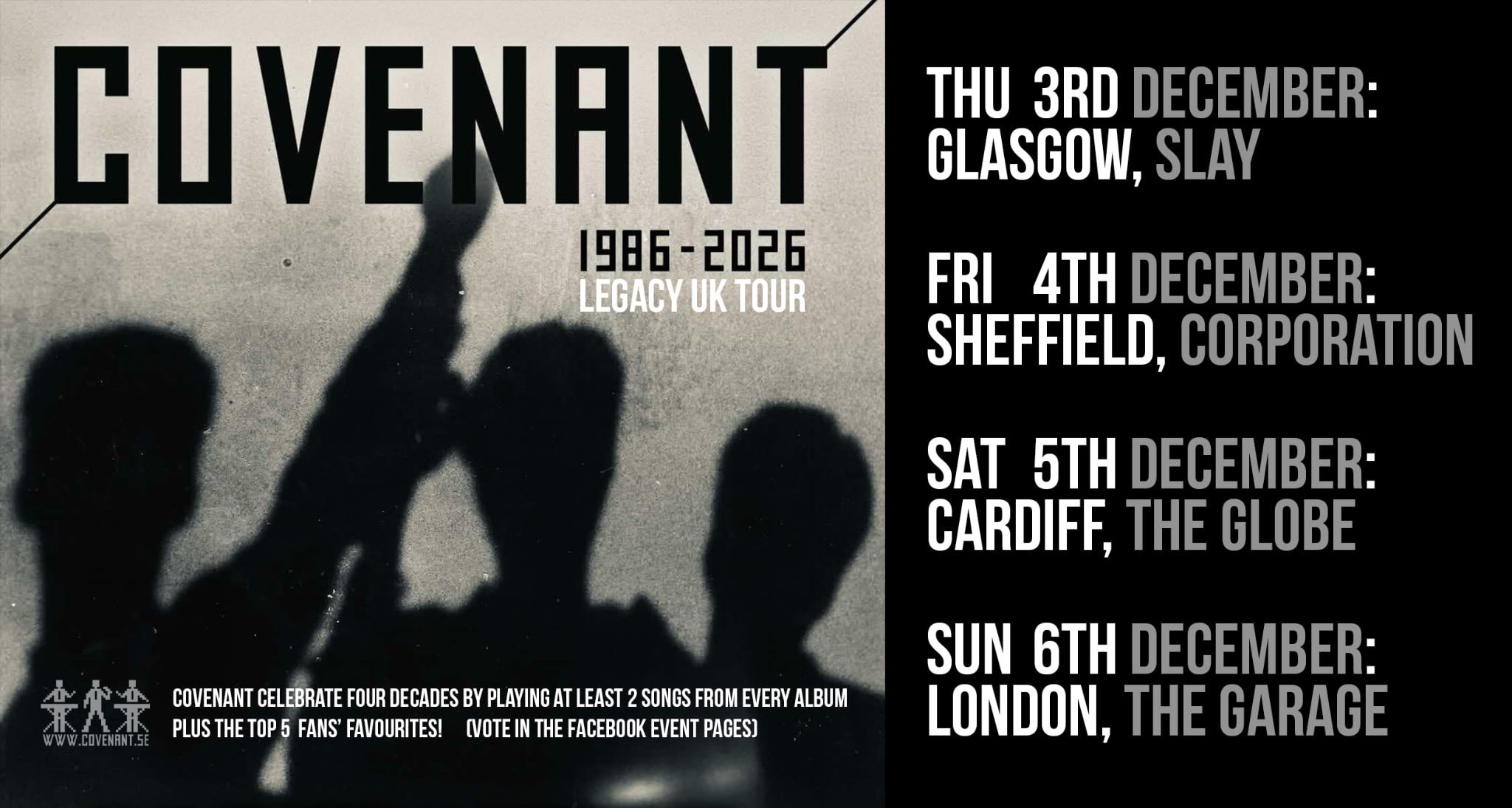 26t of April 1986, on the very eve of the Chernobyl disaster, Covenant was founded after having their senses blinded by Front 242 in Malmö at the legendary venue Stadt Hamburg.