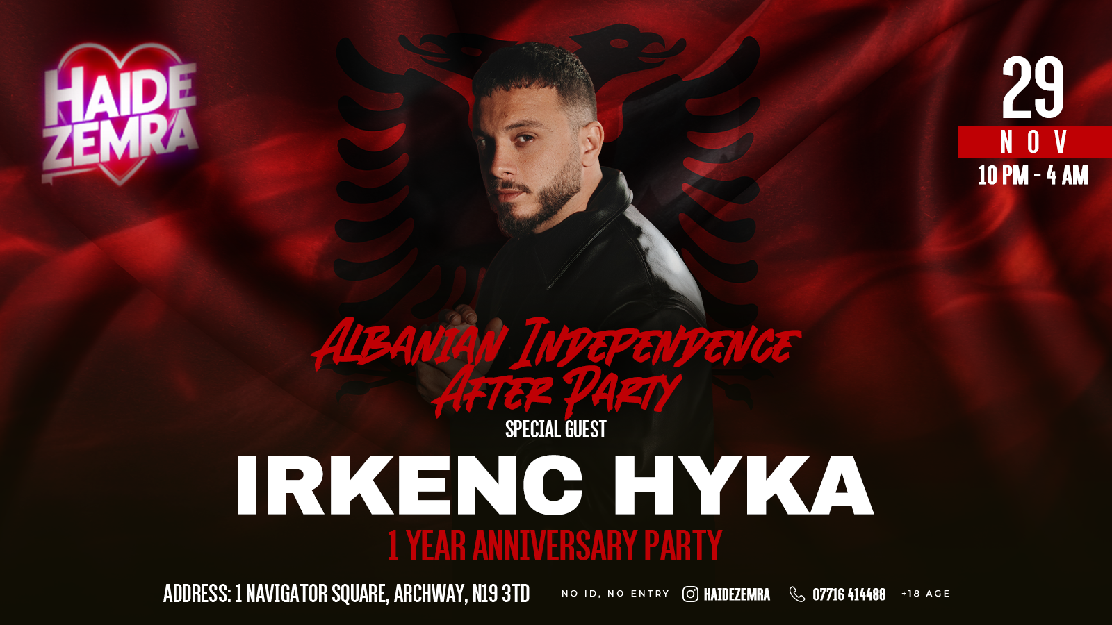 Join us on Saturday, 29th November for an exclusive Albanian Independence Day After Party featuring special guest IRKENC HYKA live on stage! 🎤🔥