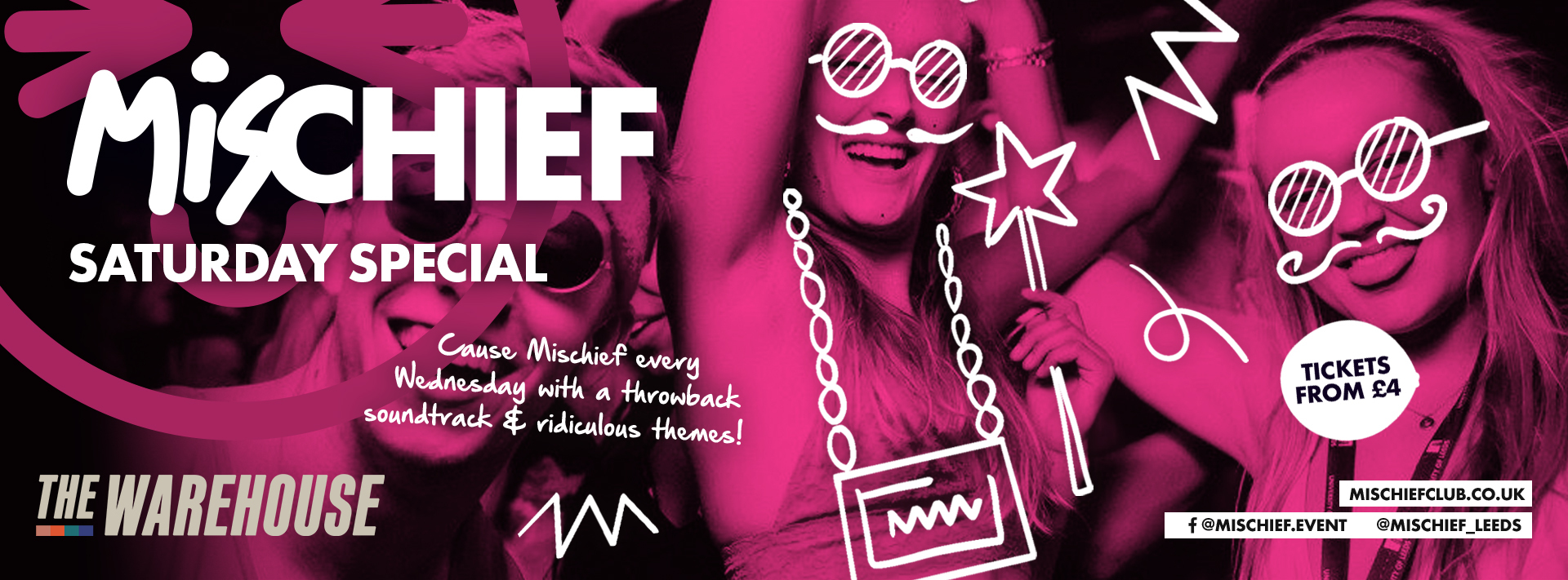 Mischief Leeds biggest Wednesday night at The Warehouse. Home of Leeds university every week, with weekly themes, balloon drops, confetti cannons & student drinks prices.