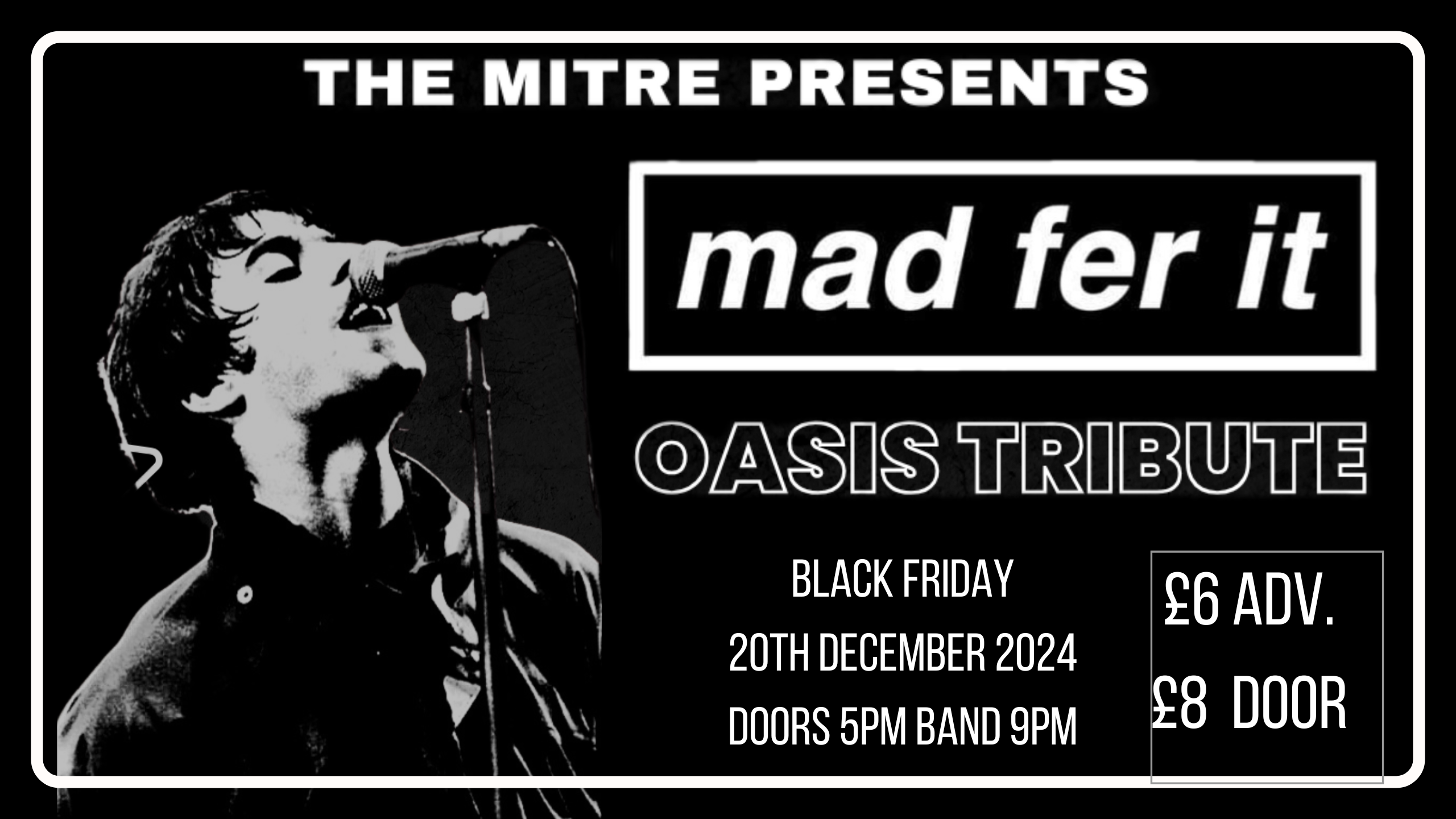 Get ready for a night of pure Oasis magic! Join us at the Mitre Inn for an electrifying tribute to one of the greatest bands of all time. Get your friends together and experience the iconic sounds of Oasis live. Sing along to all your favorite hits and immerse yourself in the nostalgia of the Britpop era. Don't miss out on this epic event - it's going to be Mad Fer It!